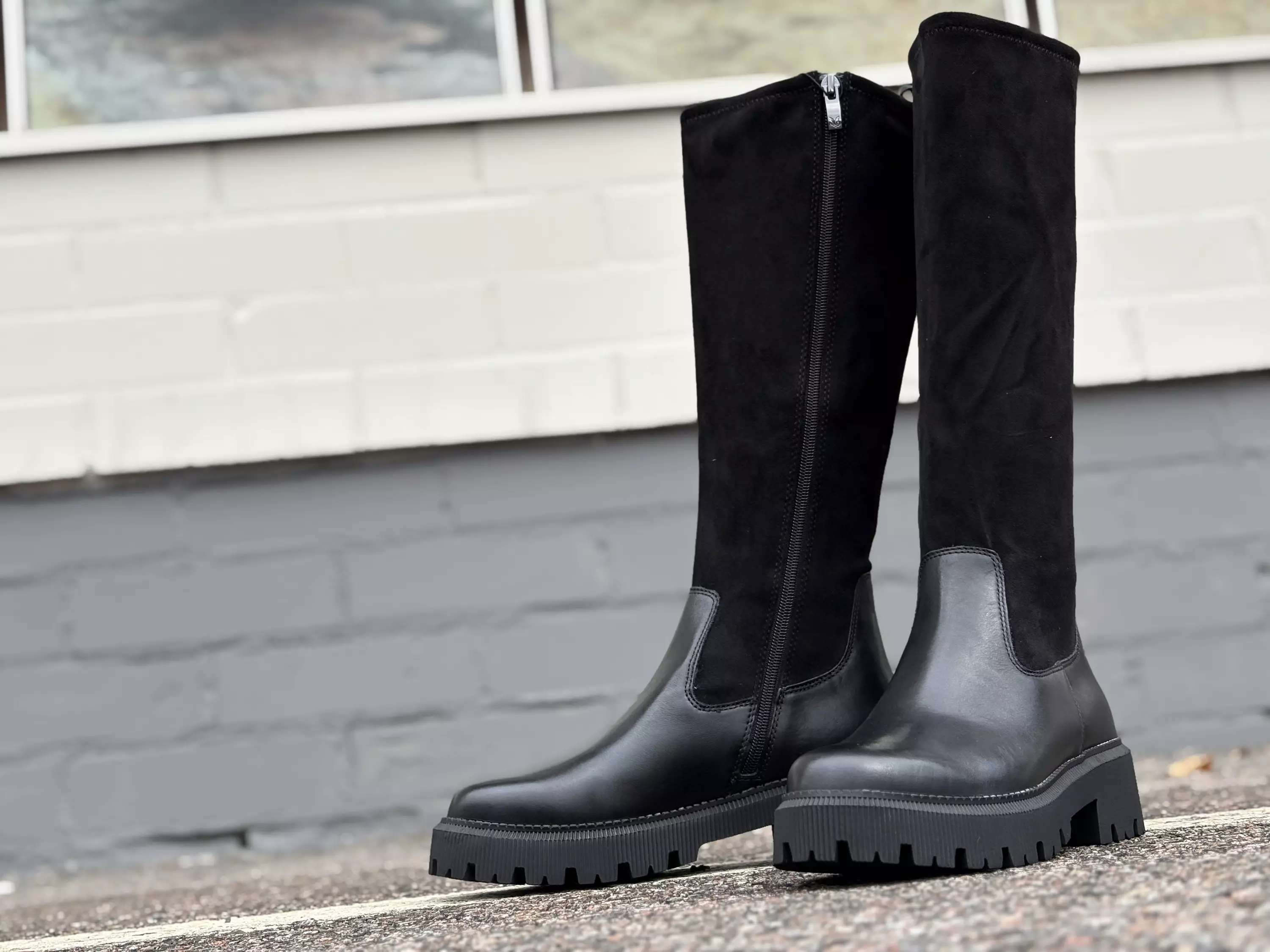 Mustat Caprice saappaat. Kärkiosaltaan nahkaiset saappaat, joissa joustavat tekstiiliset varret. Sisäsyrjällä pukemista vauhdittava vetoketju. Varressa ihanan pehmeä joustosamettinen vuori. Vaihdettavat thermo-pohjalliset, joten tarvittaessa sujautat kenkiin omia tarpeitasi parhaiten vastaavat pohjalliset. Lestimitoitus normaali G lesti. Kannan korkeus noin 5cm ja pohja korkeus päkiän alta noin 3cm.