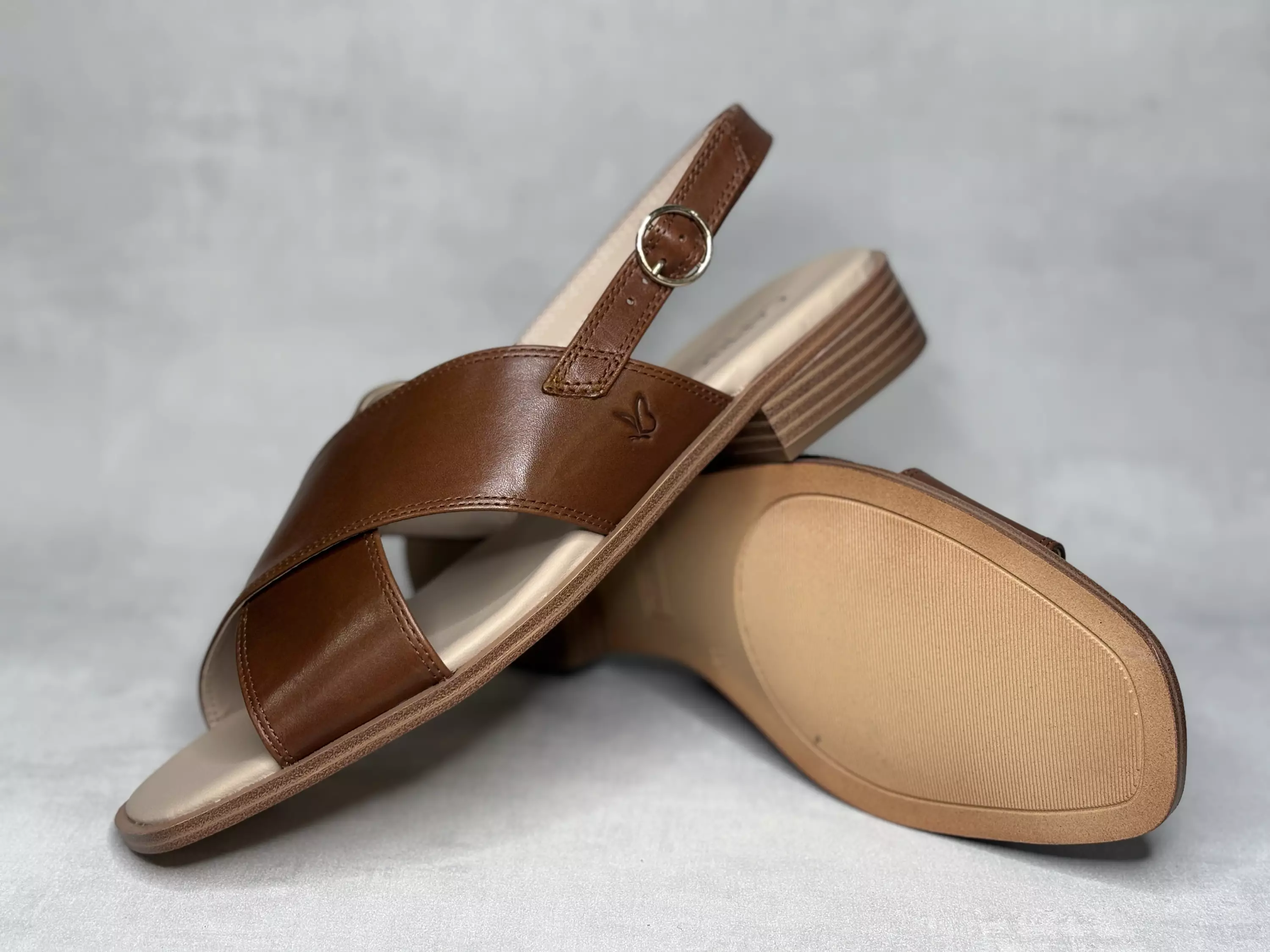 Konjakin ruskeat Caprice sandaalit. Matalakorkoiset nahkaiset sandaalit. Ristikkäin menevät kärkiremmit ja solkisäädöllä varustettu kantaremmi. Soljen alla pieni istuvuutta parantava venyke. Kannan korkeus noin 3,5cm ja pohjan korkeus päkiän alta noin 1cm.