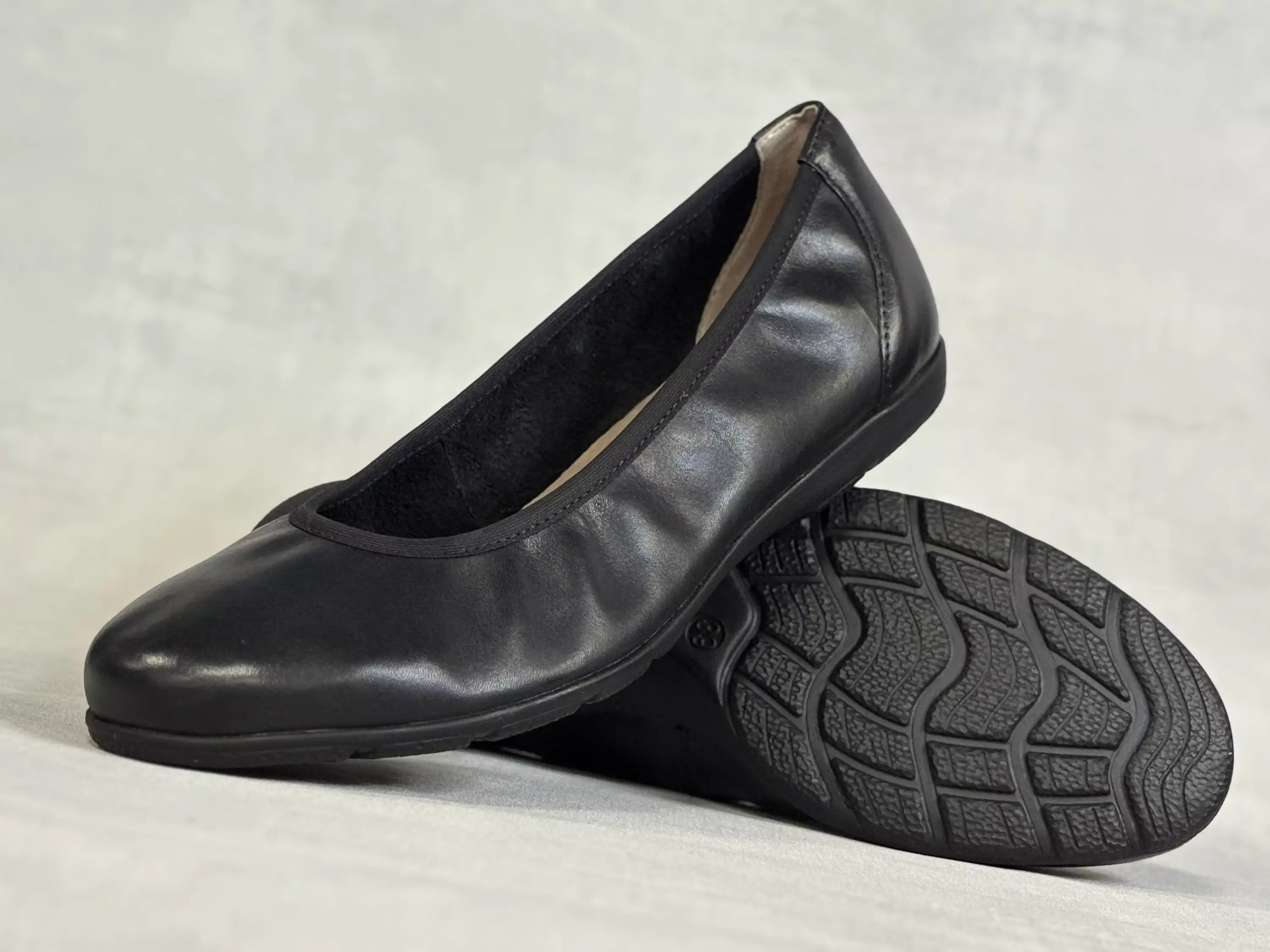 Mustat Caprice ballerinat. Musta perus-ballerinat nahkaisena versiona. Kengänsuussa joustava tekstiilikantti. Pehmeät nahkaiset ballerinat mukautuvat käytössä jalkaan. Nahkapintainen sisäpohja. Lestimitoitus normaali G. Kannan korkeus noin 1,5cm ja pohjan korkeus päkiän alta noin 1cm.