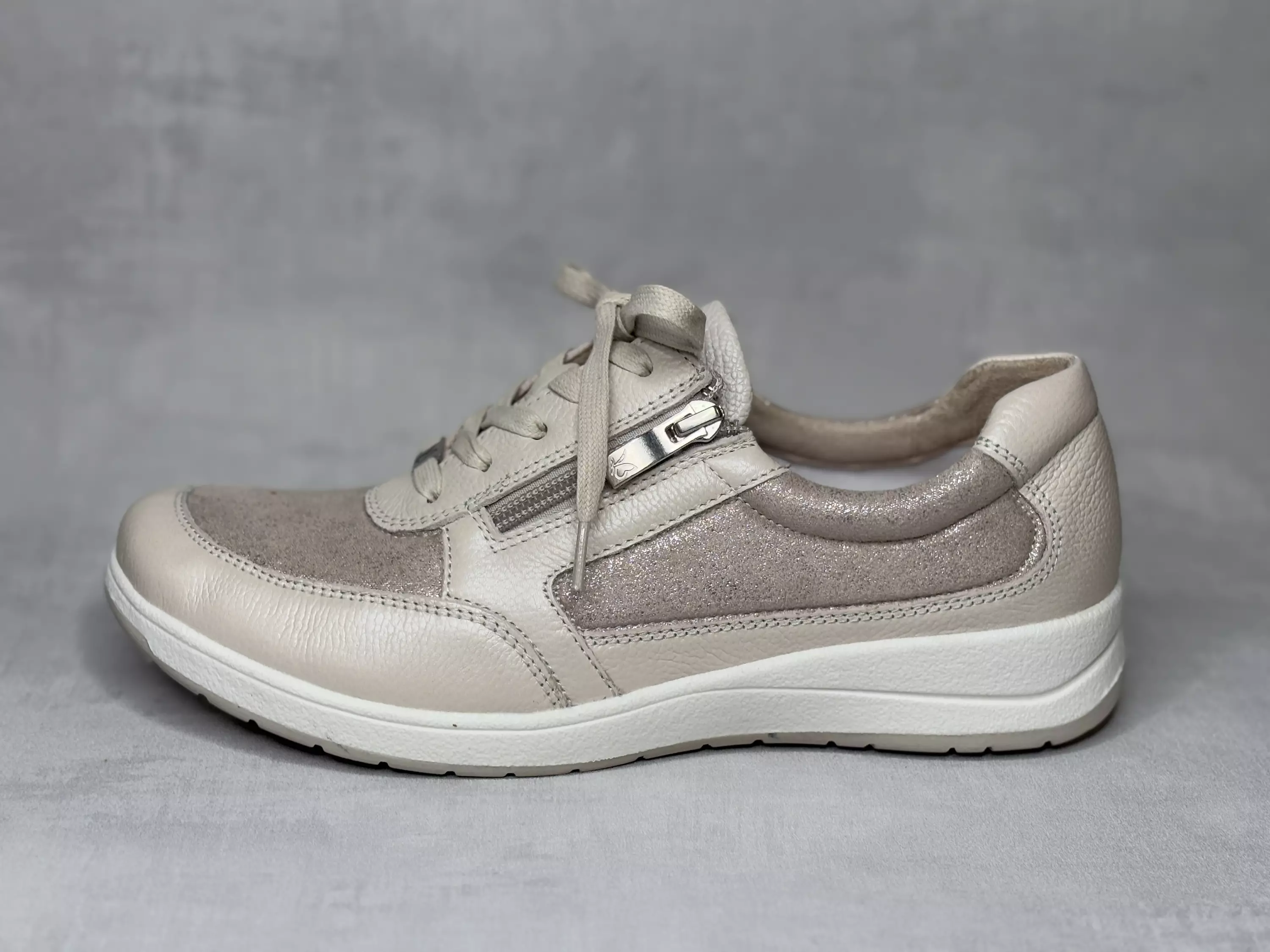 Beiget Caprice kävelykengät. Nahkaisissa osioissa kevyt helmiäisenhohde. Kimaltavat tekstiiliset osiot ovat materiaaliltaan joustavat. Nauhojen avulla kengät on helppo säätää sopivan väljiksi omaan jalkaan. Ulkosyrjälle sijoitettu vetoketju helpottaa pukemista. Vaihdettavat pohjalliset, joten tarvittaessa vaihdat kenkiin omia tarpeitasi parhaiten vastaavat pohjalliset.