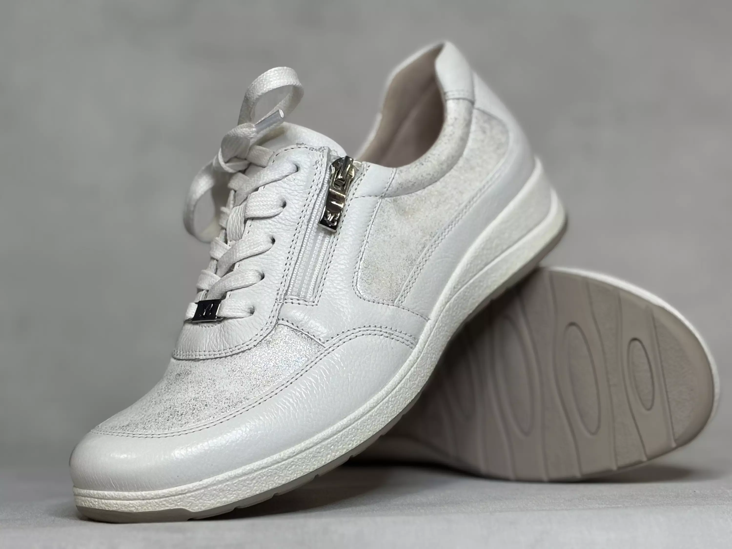Valkoiset Caprice kävelykengät. Kenkien pinta on yhdistelmä valkoista nahkaa ja hopeankimaltavaa valkoista tekstiiliä. Sopii myös vaivaisenluulliseen jalkaan. Nauhojen avulla kengät on helppo säätää omaan jalkaan sopiviksi ja ulkosyrjälle sijoitettu vetoketju vauhdittaa pukemista. Caprice Blue oxygen-pohjalliset ovat vaihdettavat, joten tarvittaessa sujautat kenkiin omia tarpeitasi parhaiten vastaavat pohjalliset. Lestimitoitus leveähkö H. Kannan korkeus noin 3cm ja pohjan korkeus päkiän alta noin 1,5cm.
