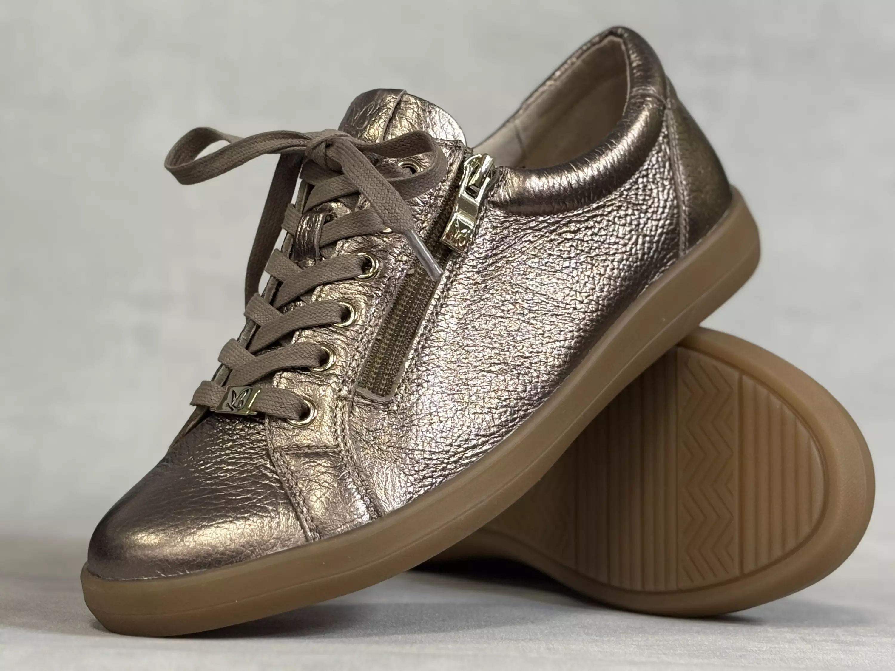 Tumman kultaiset Caprice Taupe metal deer kävelykengät. Metallinhohtavat, pehmeästä peuran nahasta valmistetut kävelykengät. Ulkosyrjällä pukemista vauhdittava vetoketju. Nauhojen avulla säädät kengät omaan jalkaan sopiviksi. Tekstiilipintaiset pohjalliset ovat vaihdettavat, joten tarvittaessa sujautat kenkiin omia tarpeitasi parhaiten vastaavat pohjalliset. Lestimitoitus leveähkö H. Kannan korkeus noin 2,5cm ja pohjan korkeus päkiän alta noin 1cm.