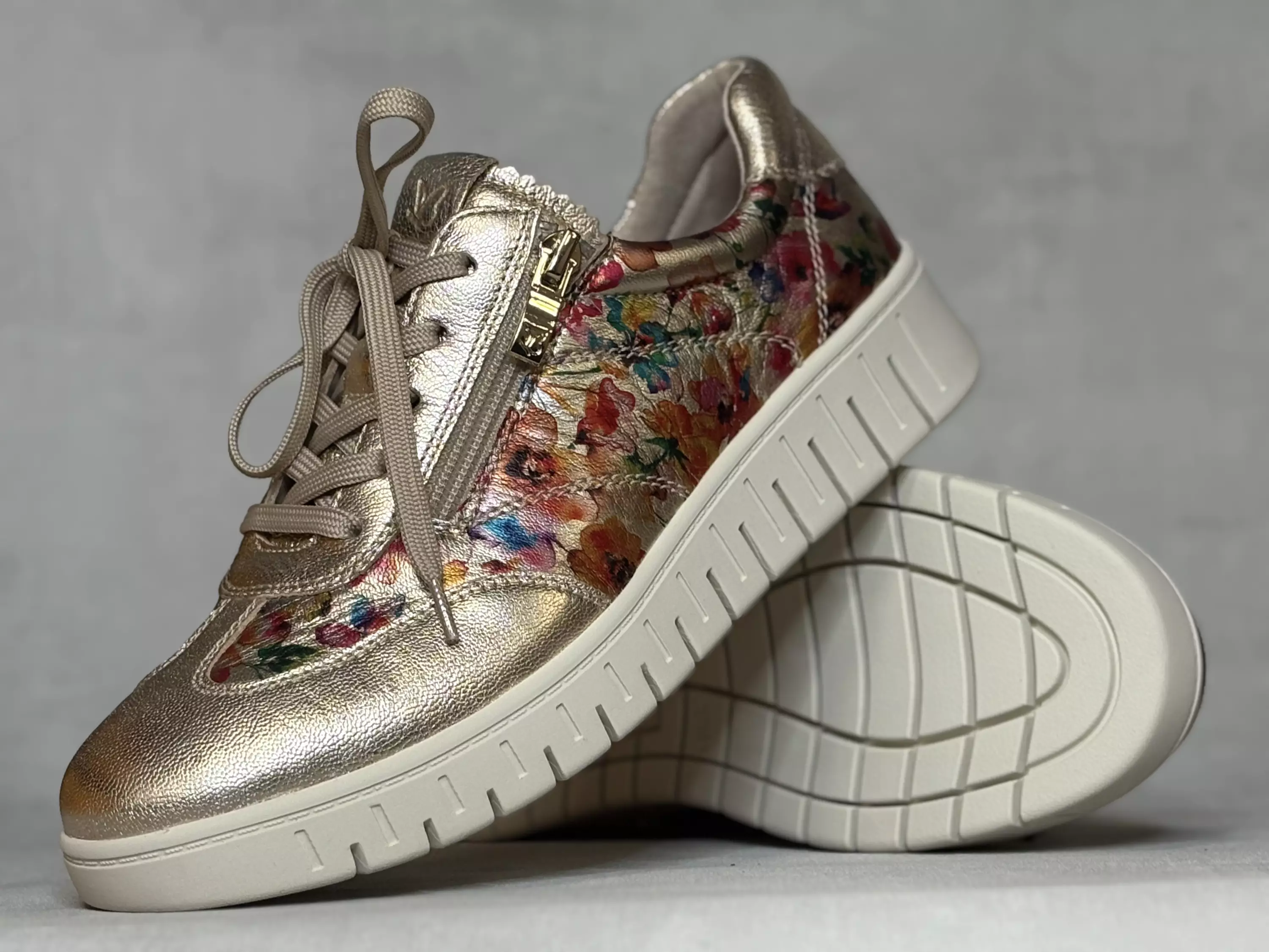 Kultaiset kukkakuvioidut Caprice kävelykengät. Akvarellivärimäisen hempeät moniväriset kukkakuviot antavat näille kultaisille kävelykengille kerrassaan upean ilmeen! Nauhojen avulla kengät on helppo säätää jalkaan ja ulkosyrjälle sijoitettu vetoketju vauhdittaa pukemista. Kevyesti muotoillut nahkapintaiset pohjalliset ovat vaihdettavat Suosittelemme pesupussin käyttöä. Tarvittaessa sujautat kenkiin omia tarpeitasi parhaiten vastaavat pohjalliset. Lestimitoitus leveähkö H. Kannan korkeus noin 3,5cm ja pohjan korkeus päkiän alta noin 2cm.