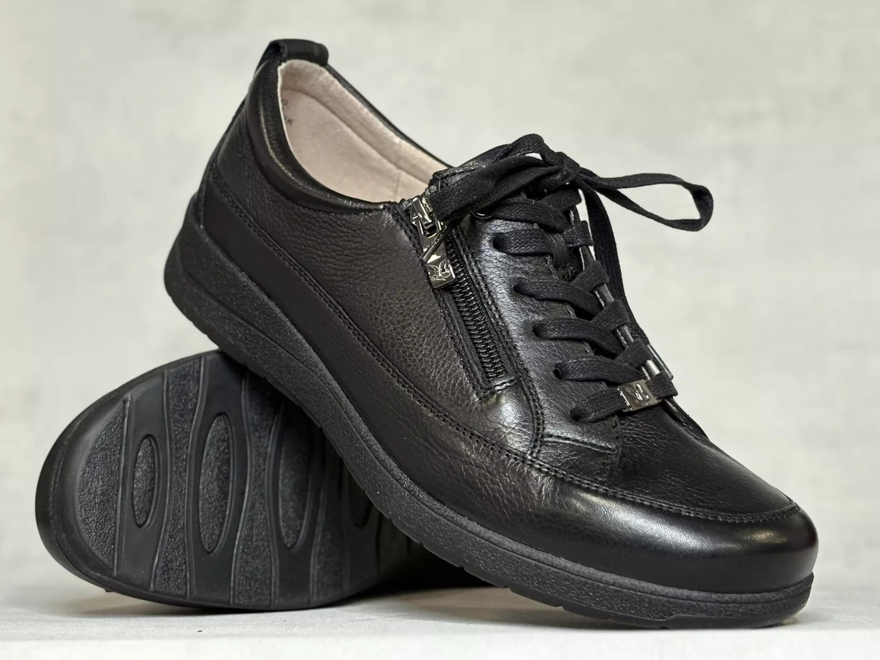 Mustat Caprice kävelykengät. Leveällä K-lestillä varustetut nahkaiset kävelykengät. Nauhojen avulla säädät kengät helposti omaan jalkaan sopiviksi. Ulkosyrjälle sijoitettu vetoketju nopeuttaa pukemista. Caprice Blue Oxygen-pohjalliset ovat vaihdettavat, joten tarvittaessa sujautat kenkiin omia tarpeitasi parhaiten vastaavat pohjalliset. Kannan korkeus noin 3cm, pohjan korkeus päkiän ala noin 1,5cm.