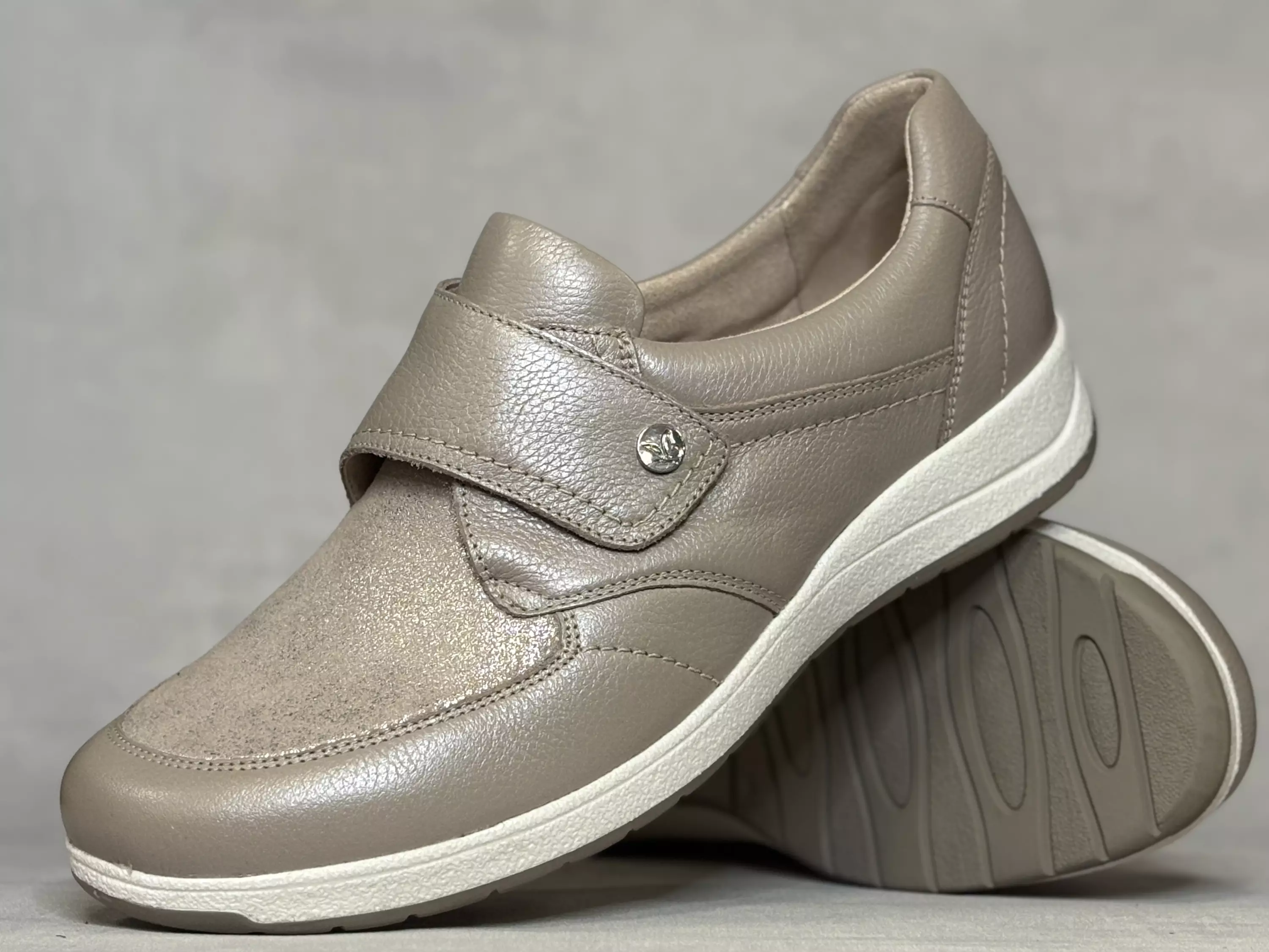 Taupet Caprice kävelykengät. Tarrasäätöisellä remmillä varustetut kävelykengät. Nahkapintaiset kengät, joiden kärjessä tekstiilinen osio, sopivat mainiosti vaivaisenluulliseen jalkaan. Leveä K-lesti. Vaihdettavat pohjalliset, joten tarvittaessa sujautat kenkiin omia tarpeitasi parhaiten vastaavat pohjalliset. Kannan korkeus noin 3cm, pohjan korkeus päkiän alta noin 1,5cm.