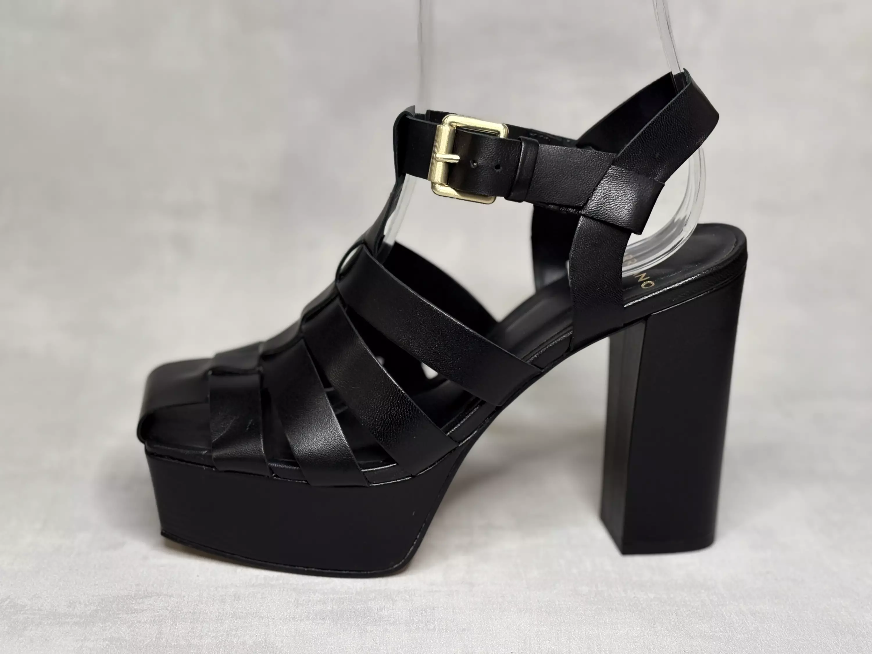 Säväyttävät mustat Carrano platform sandaalit. Näyttävät remmit ja muodikas katkaistu kärki. Sandaaleissa on soljellinen nilkkaremmi, jonka sisäsyrjällä on pieni istuvuutta parantava venyke. Tukeva tolppakorko ja paksu platform. Mielenkiintoinen muotokieli, laadukkaat nahat ja loistava istuvuus tekevät tästä korkokengästä mainion valinnan sinulle, joka et pelkää kääntää katseita!