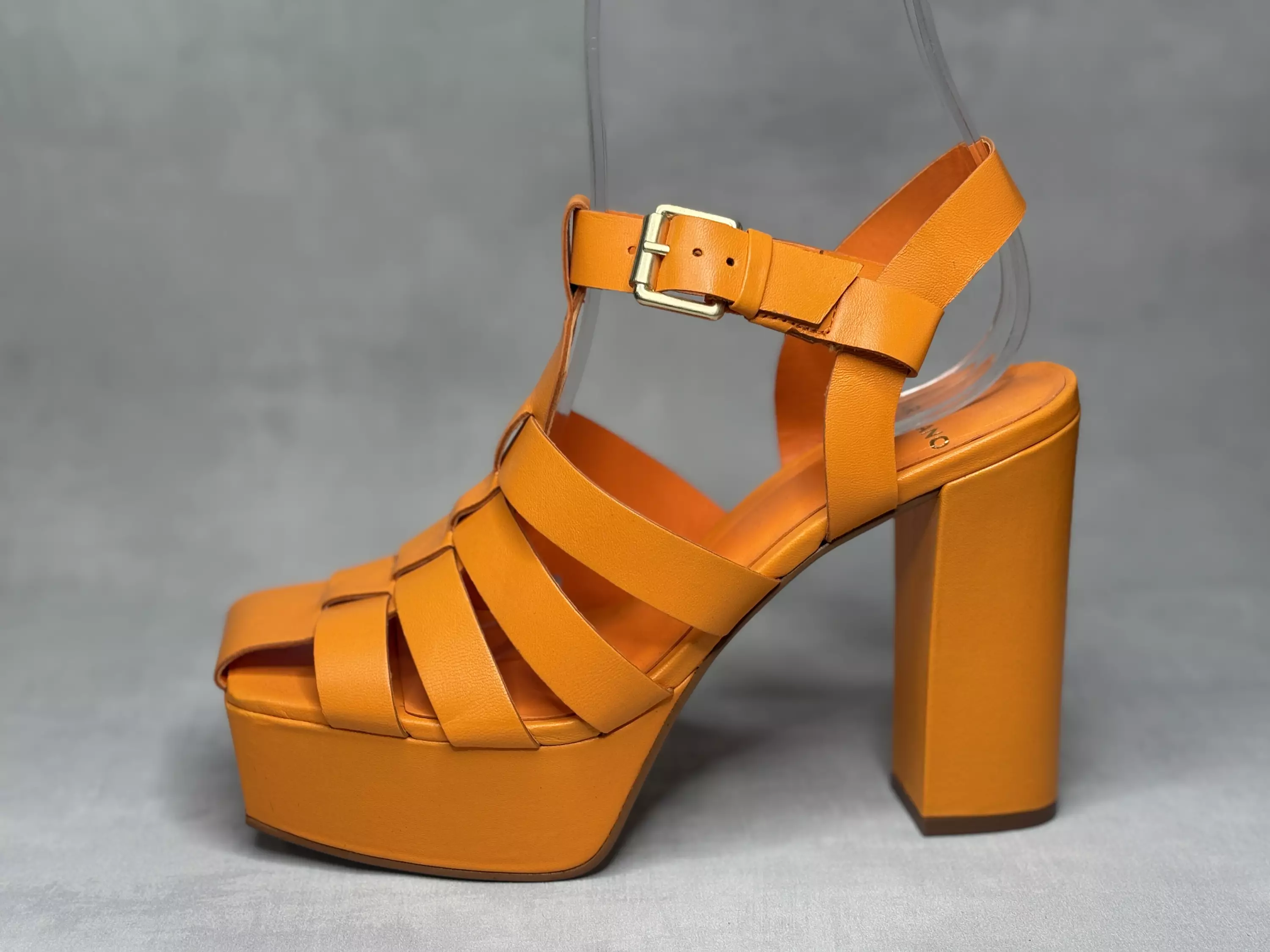 Säväyttävän oranssit Carrano platform sandaalit. Näyttävät remmit ja muodikas katkaistu kärki. Sandaaleissa on soljellinen nilkkaremmi, jonka sisäsyrjällä on pieni istuvuutta parantava venyke. Tukeva tolppakorko ja paksu platform. Mielenkiintoinen muotokieli, laadukkaat nahat ja loistava istuvuus tekevät tästä korkokengästä mainion valinnan sinulle, joka et pelkää kääntää katseita!