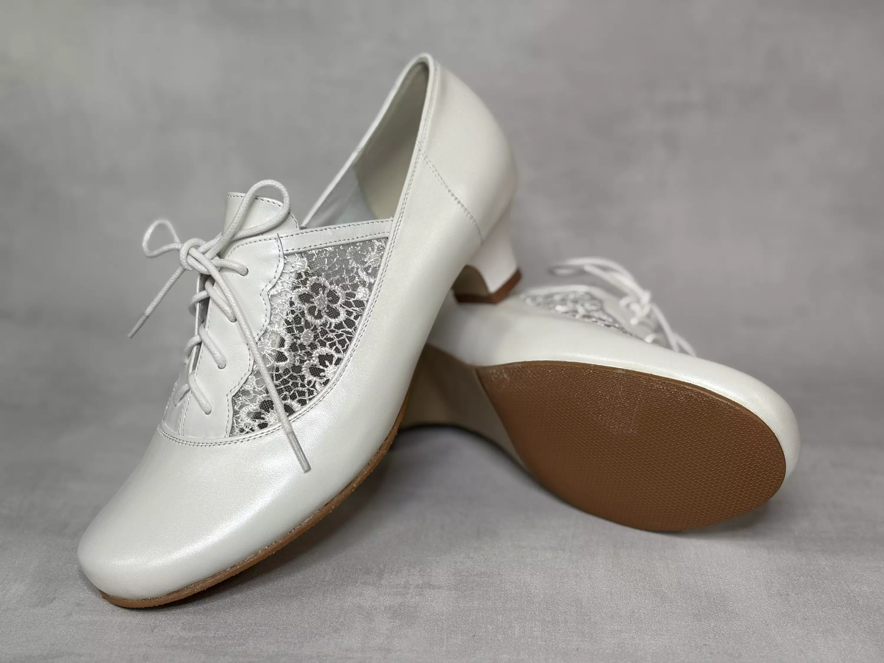 Valkoiset matalakorkoiset Chantana korkokengät. Nahkaiset kävelykengät ihastuttavilla pitsisivuilla sekä nauhoituksella. Mikäli haluat kenkiin lisäilmettä, voit vaihtaa niihin vaikkapa satiiniset kengännauhat. Kannan korkeus noin 4cm, pohja edestä noin 0,5cm.