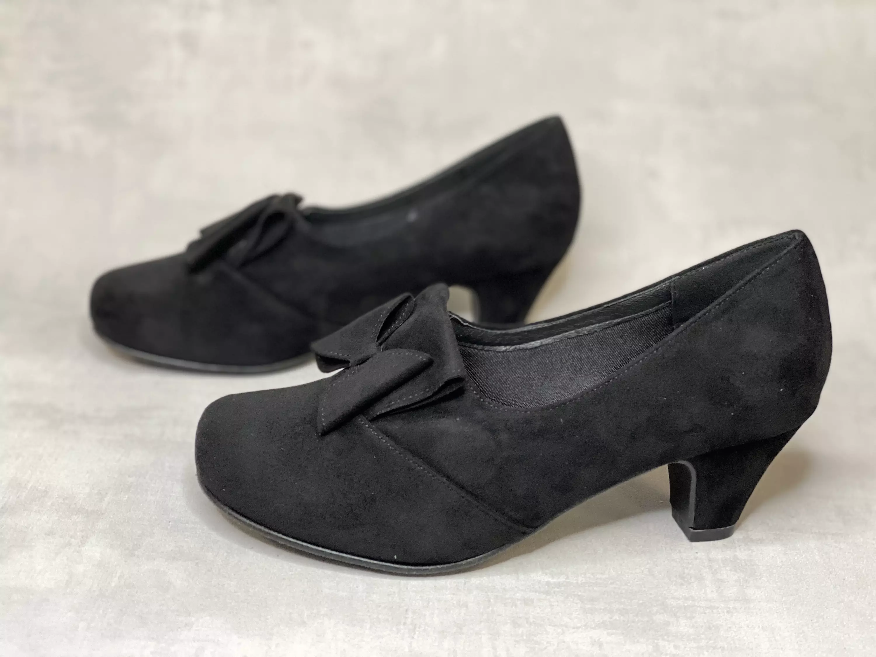 Mustat laajalestiset Chantana avokkaat. Korkokengissä on sievä rusetti ja Chantanalle tuttuun tyyliin noin 5cm korkea korko. Rusetin alla on istuvuutta parantava venyke. Näitä ihania avokkaita on ulkonäkönsä perusteella tituleerattu Pikku Myyn tanssikengiksi.