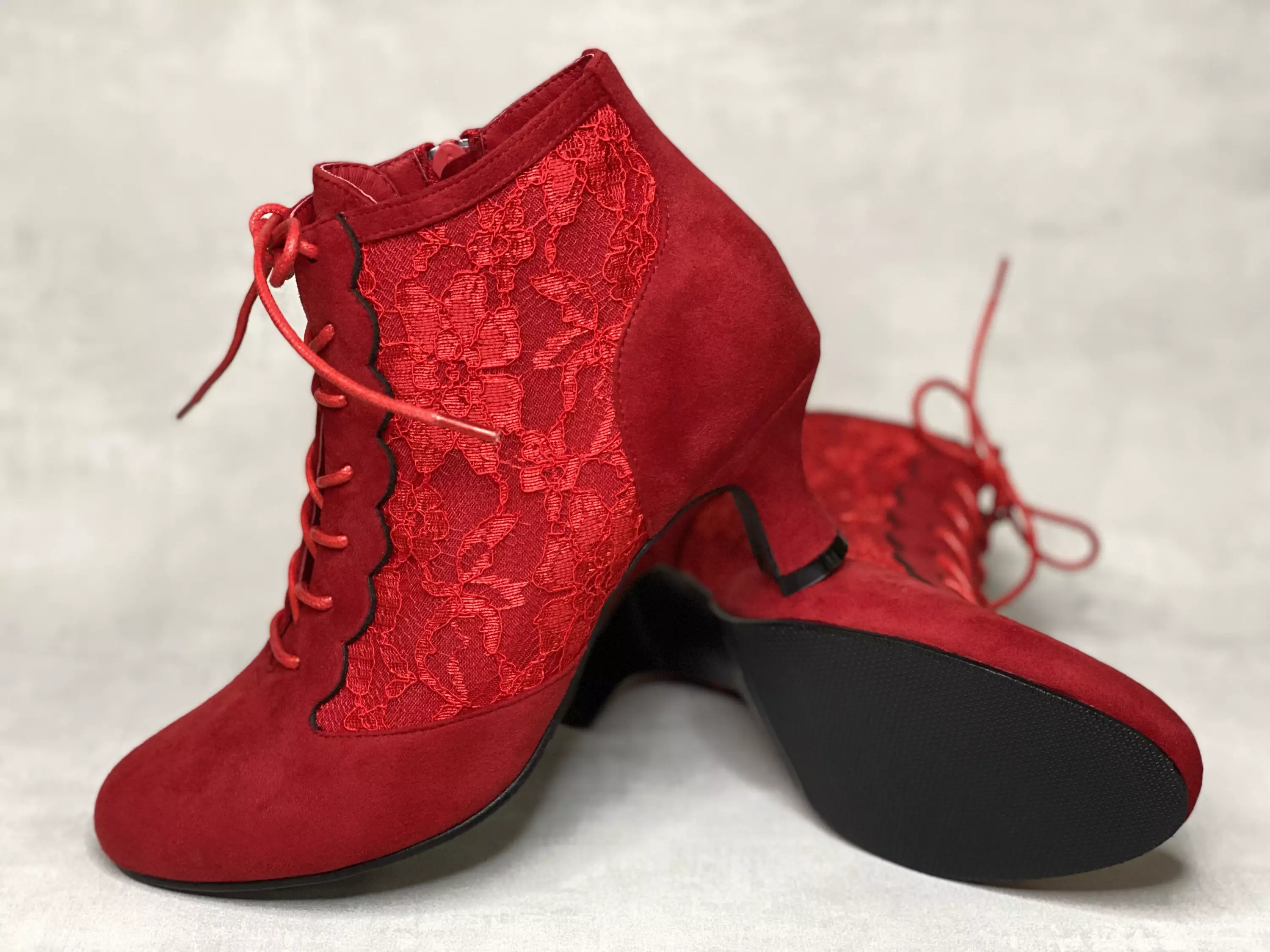 Punaiset Chantana nilkkurit. Nilkkureiden pinta on pehmeää mikrokuitua. Kengän sisä- ja ulkosyrjällä on upea kukkakuosinen pitsikangas. Nauhojen avulla nilkkurit on helppo säätää omaan jalkaan sopivan kireälle ja sisäsyrjälle sijoitettu vetoketju vauhdittaa pukemista. Nilkkureissa on nahkavuori.