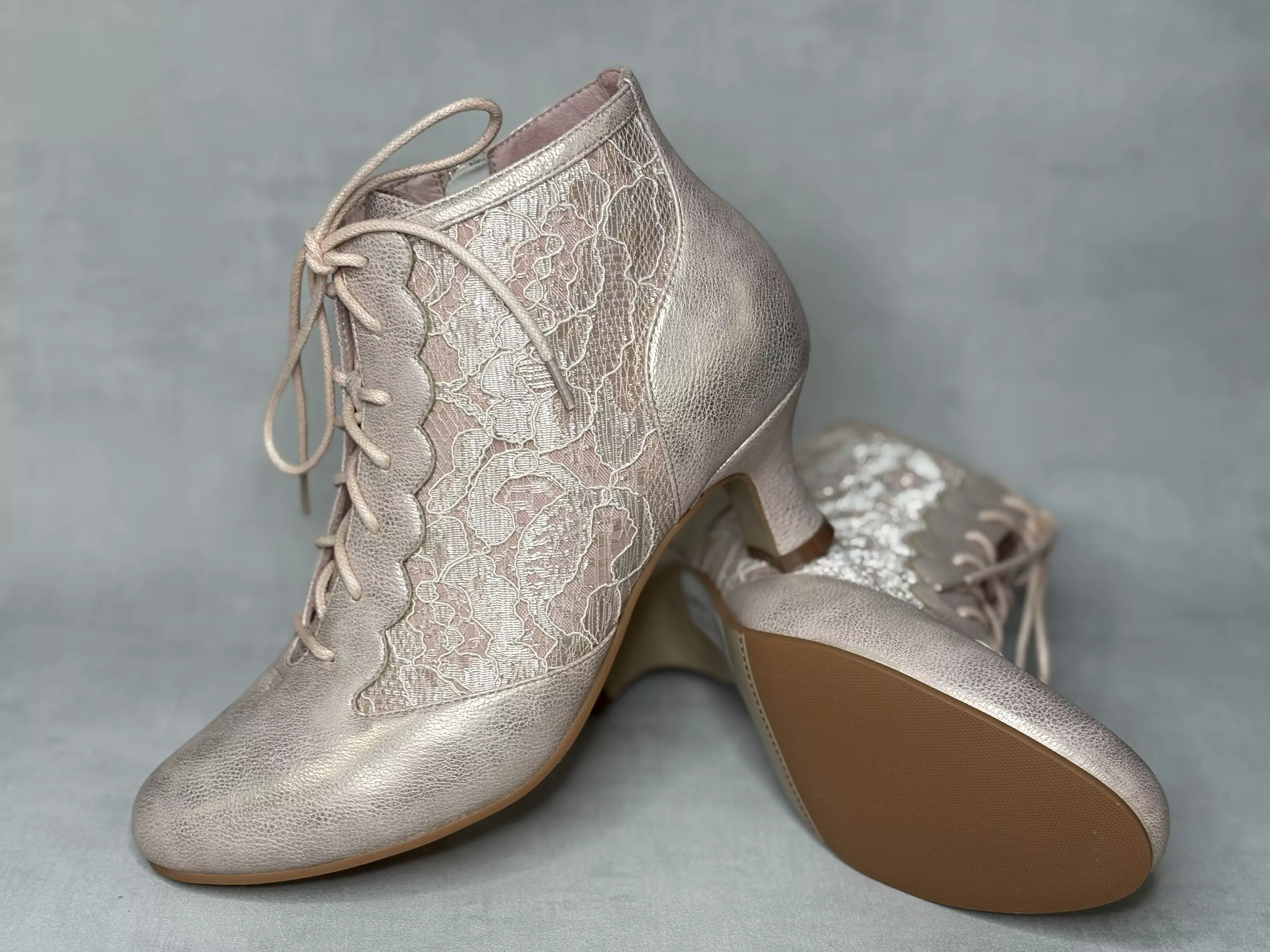 Vaaleanpunaiset kullanhohtoiset Chantana nilkkurit. Kengän sisä- ja ulkosyrjällä on upea pitsikangas. Nauhojen avulla nilkkurit on helppo säätää omaan jalkaan sopivan kireälle ja sisäsyrjälle sijoitettu vetoketju vauhdittaa pukemista. Nilkkureissa on nahkavuori.