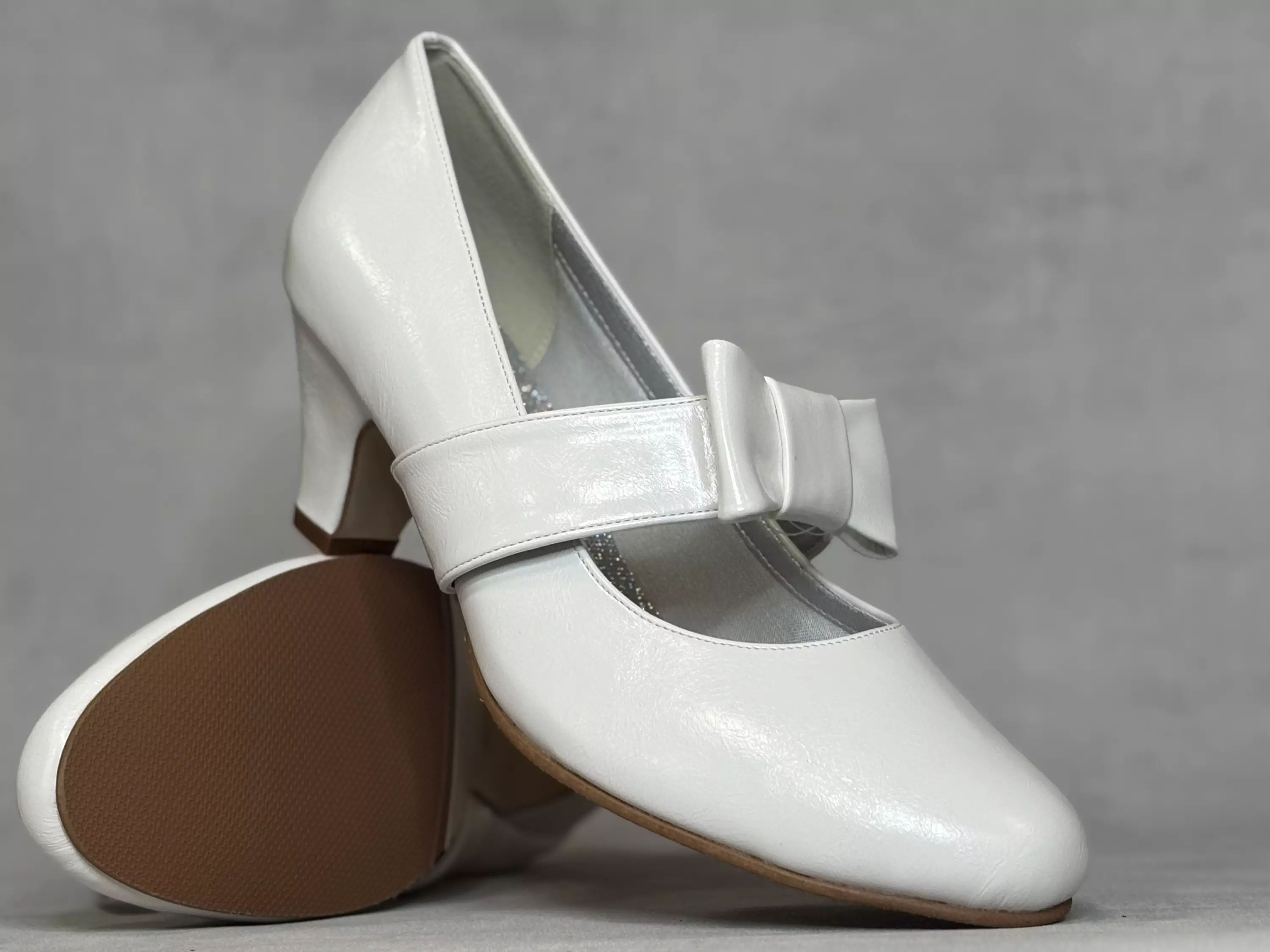 Valkoiset Chantana korkokengät ihanalla rusettiremmillä, joka asettuu somasti jalkapöydän päälle. Kenkien pinta on nahkaa muistuttavaa synteettistä materiaalia. Rusetin alla on pienet venykkeet, joiden jouston ansiosta kengät on helppo pukea jalkaan. Lisäksi ne parantavat kengän istuvuutta. Chantana korkokengissä on maltillinen 5cm korkea korko, joka sopii mainiosti myös niille, jotka eivät ole tottuneet käyttämään korkekenkiä. Jalka on Chantanan korkokengissä mukavassa asennossa.