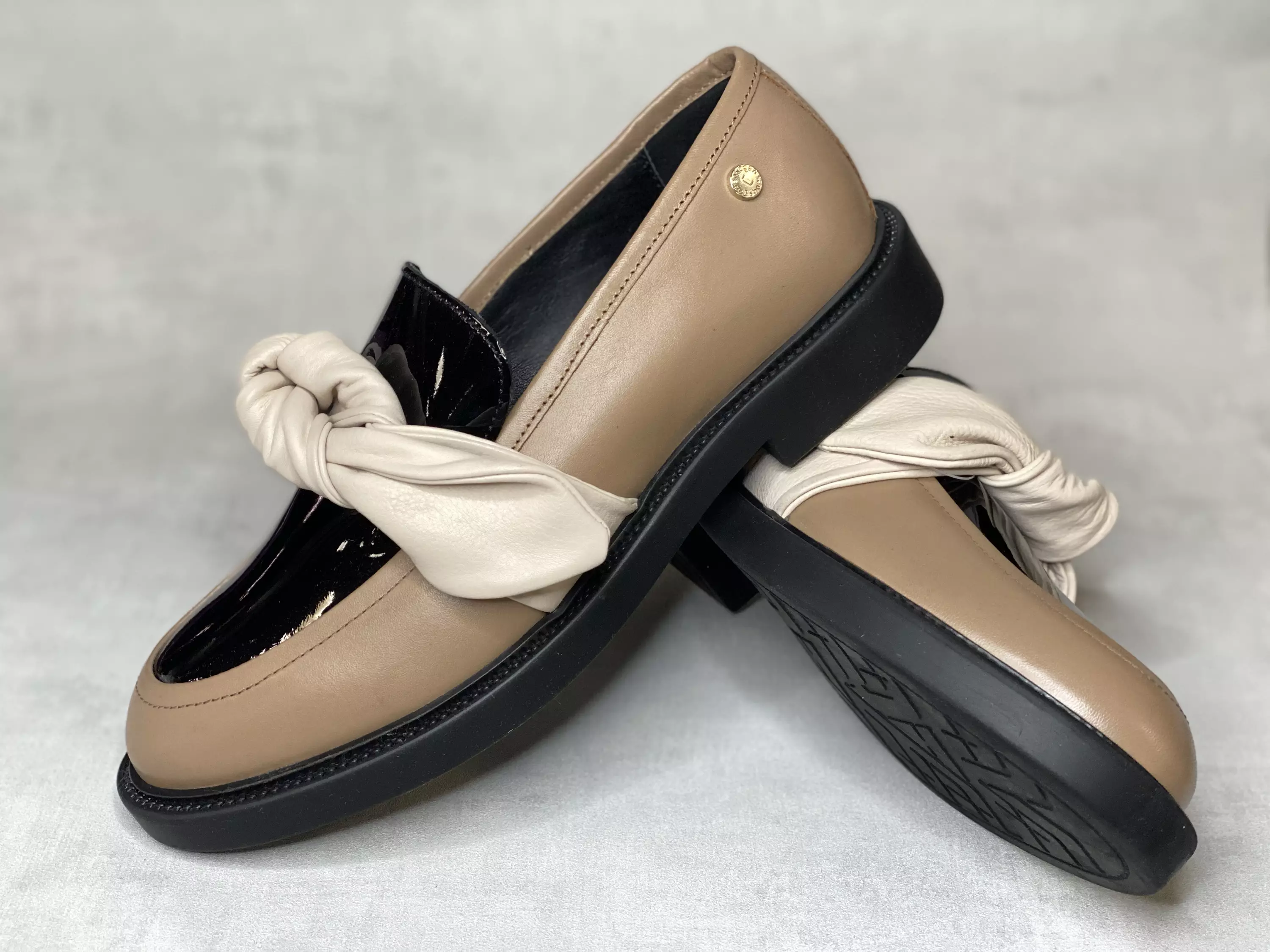 Vaaleanruskeat Copenhagen Shoes - Will you walk loaferit. Musta lakerinahkainen pääliosa. Nuden värinen nahkainen rusettikoriste kruunaa nämä kävelykengät. Kengän takaosassa pieni kullan värinen metallinen koristenappi, jossa Copenhagen teksti. Kannan korkeus noin 3cm, pohjan korkeus päkiän alta noin 2cm.
