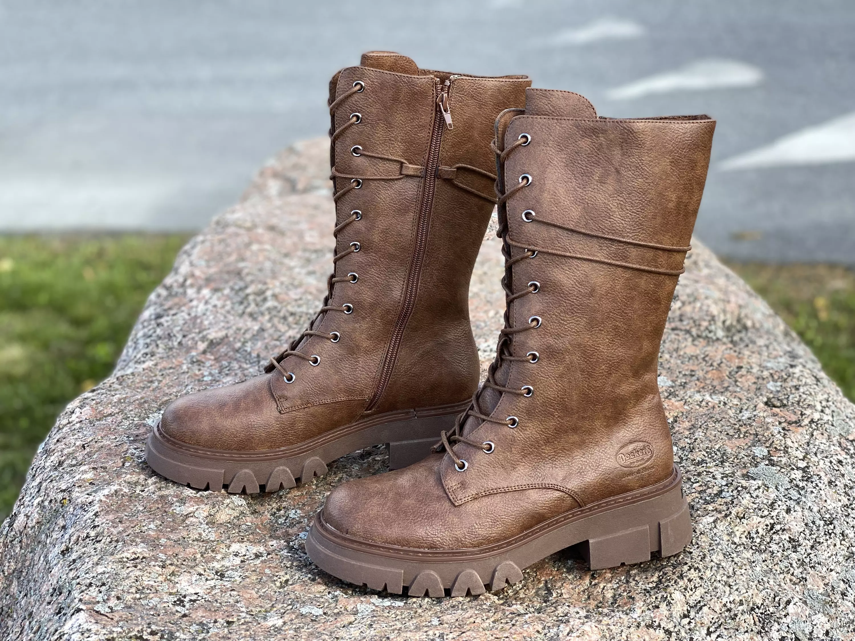 Ruskeat Dockers maiharit. Pitkävartiset maiharit paksulla volyymipohjalla. Maihareissa yksityiskohtana vinkeä varren ympäri kulkeva nauhoitus, jonka avulla kengät on helppo säätää omaan jalkaan sopiviksi! Sisäsyrjällä pukemista helpottava vetoketju. Ulkosyrjällä kannassa on kenkään kuvioitu Dockers logo. Kannan korkeus noin 5cm, pohja edestä noin 3cm.