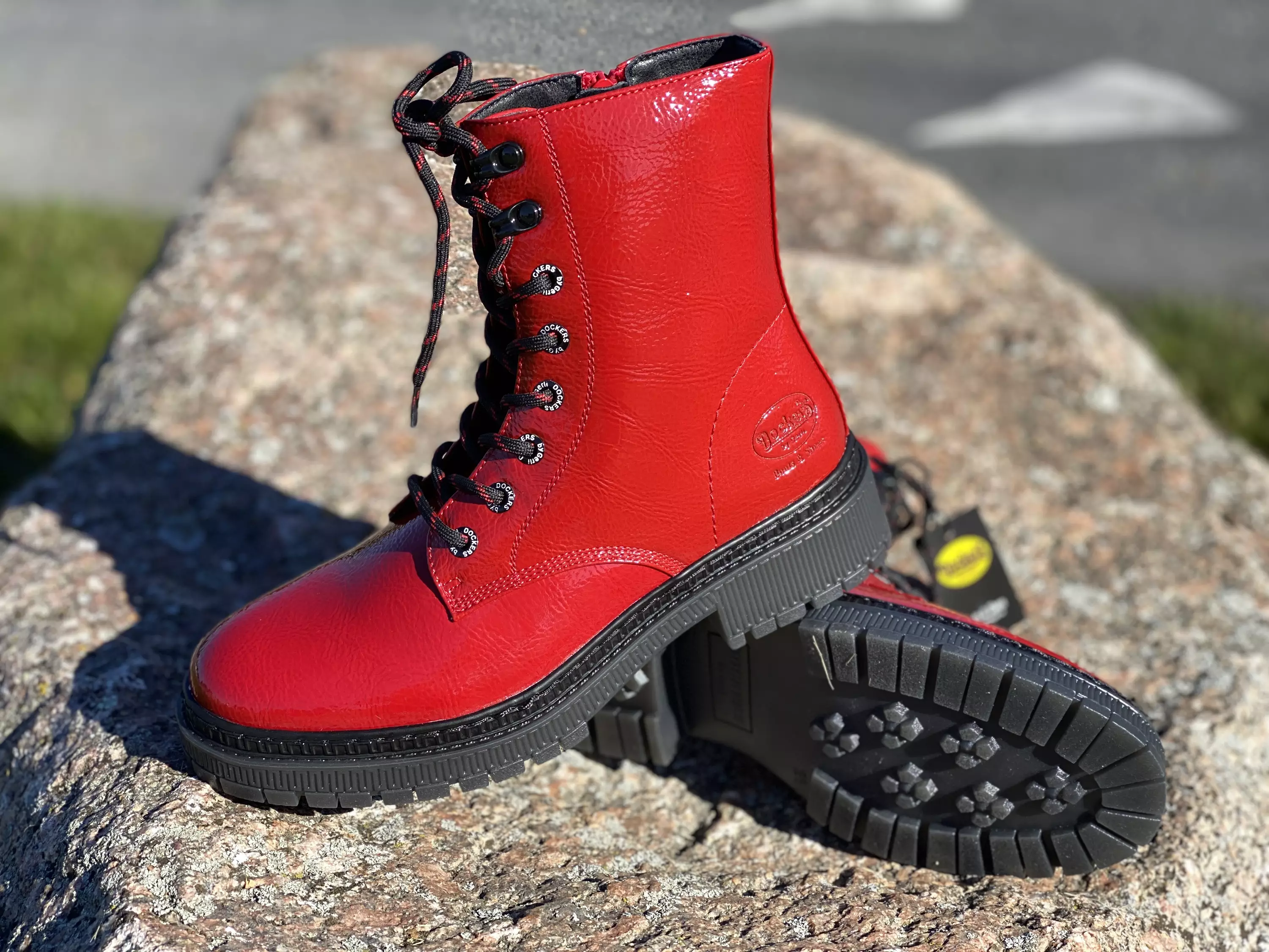 Punaiset Dockers maiharit. Ohuella tekstiilivuorilla varustetut lakerinkiiltävät maiharit. Nauhoituksen mustissa sirkkarenkaissa valkoinen Dockers by Gerli-teksi, musta-punaiset kengännauhat ja pukemista vauhdittava vetoketju sisäsyrjällä. Ei ihmeellisempiä yksityiskohtia, kannassa painettu Dockers-logo ja kaareva tikkaus, muutoin nämä maiharit luottavat kiiltävään punaiseen pintamateriaaliinsa. Kannan korkeus noin 3,5cm, pohjan korkeus päkiän alta noin 2cm.