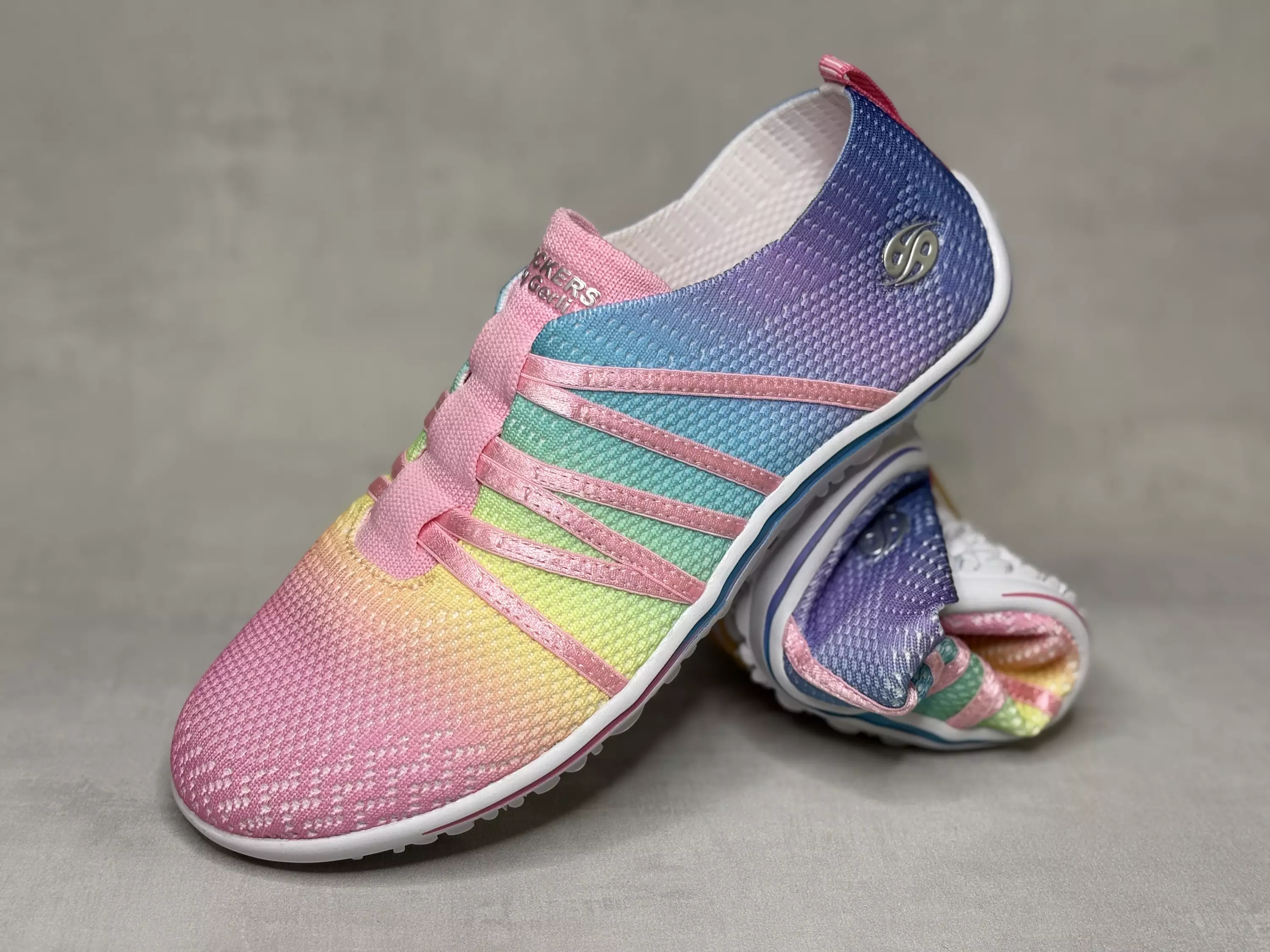 Uskomattoman kevyet moniväriset Dockers by Gerli paljasjalkakengät. Sateenkaarenkirjava kenkä, jossa vaaleanpunainen iltti ja päälitikkaukset. Ohutpohjainen kenkä kiertyy, kääntyy ja vääntyy jalkasi liikkeiden mukaan, rajoittaen jalkasi luonnollisia liikkeitä mahdollisimman vähän. Kengän sisäpohjan päällä on ohut sisäpohjallinen.