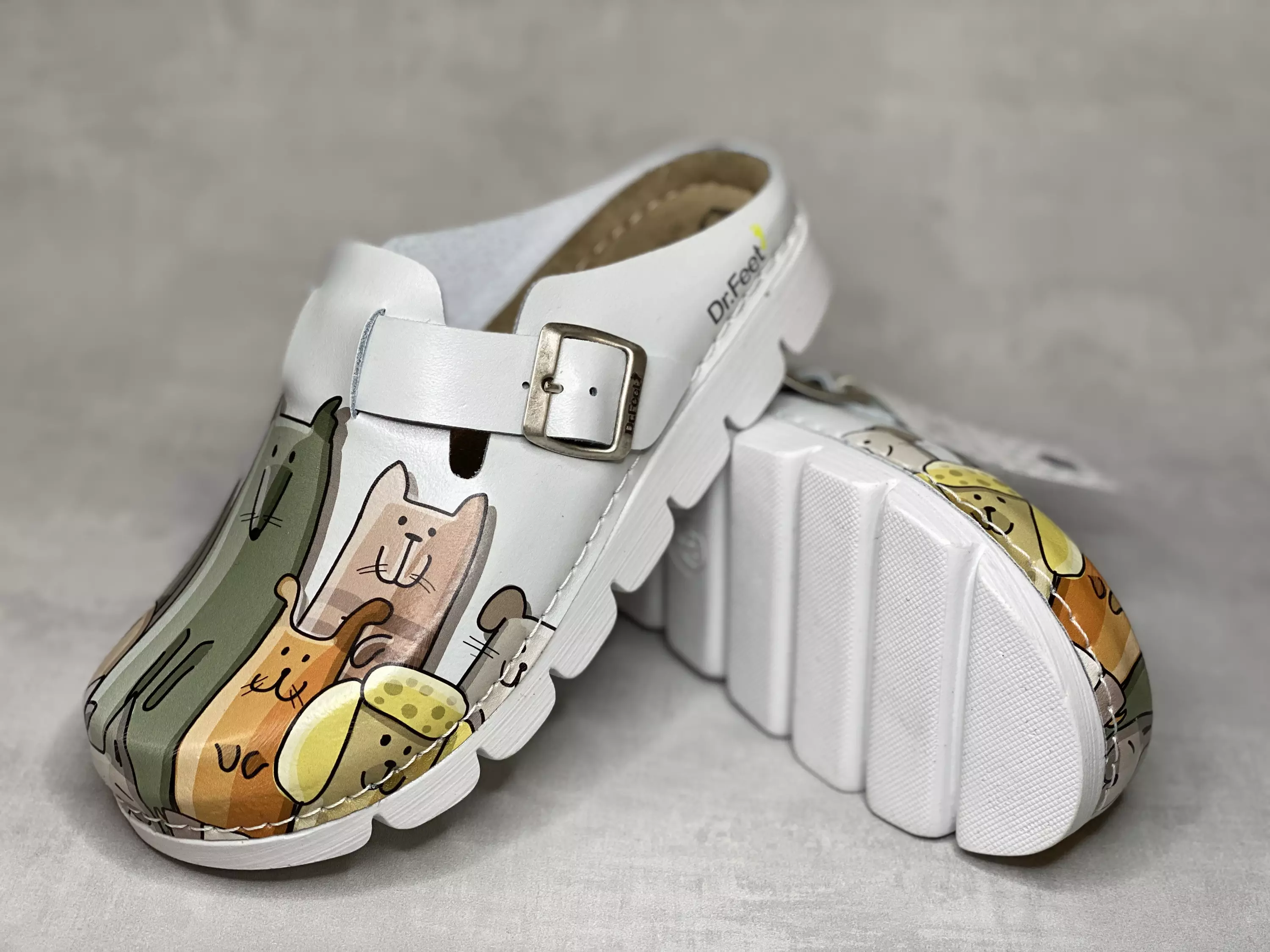 Pohjaväriltään vaaleansiniset Dr.Feet työkengät. Hauskat koirakuvioiset pistokkaat on varustettu soljella säädettävällä remmillä. Anatomisesti muotoiltu jalkaan mukautuva nahkapintainen sisäpohja. Iskuja vaimentava kantaosa.