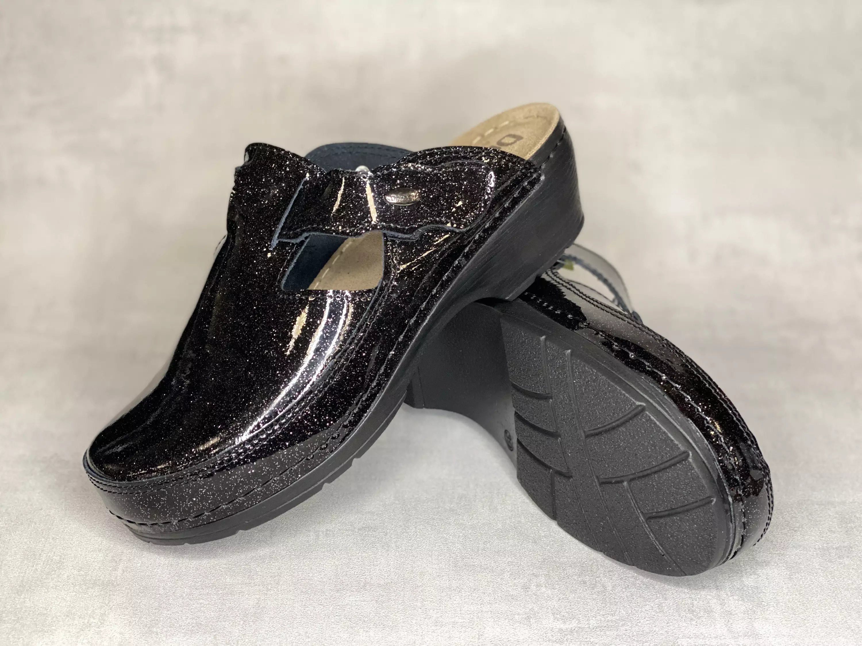 Kimaltavat mustat Dr.Feet työkengät. Hauskat kimaltavat pistokkaat on varustettu tarralla säädettävällä remmillä. Anatomisesti muotoiltu jalkaan mukautuva nahkapintainen sisäpohja. Iskuja vaimentava kantaosa. Kannan korkeus noin 5cm.