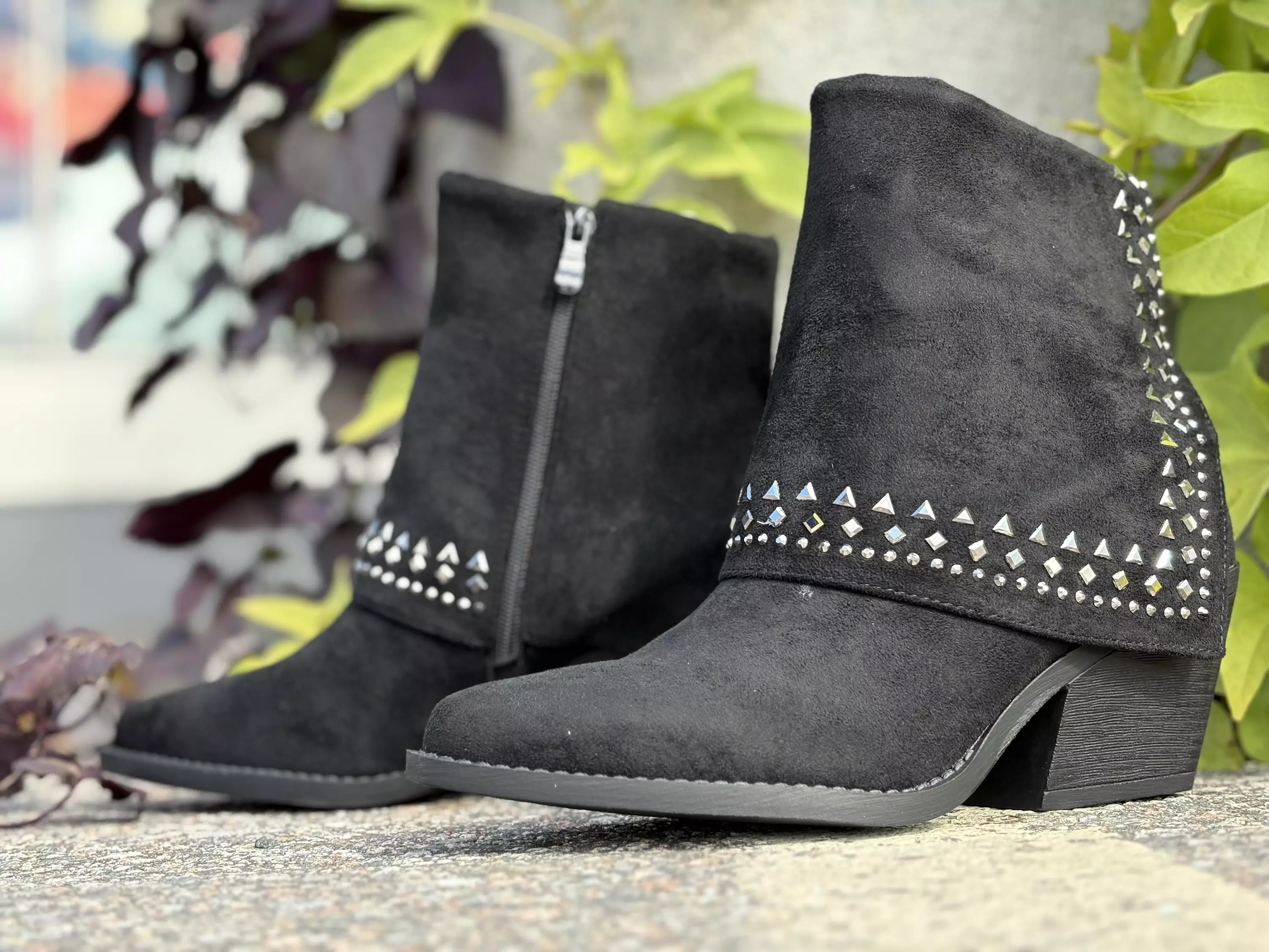 Mustat Duffy bootsit. Fold over bootsit, eli vapaasti käännettynä kääntövarrelliset buutsit, nilkkurit ja saapikkaat surffaavat trendien aallonharjalla! Tekstiilipintaiset korolliset nilkkurit, joiden pääliosan reunassa upeasti valoa taitavat strassit. Buutseille tuttuun tyyliin kapeneva kärki. Tukeva korko kaartuu linjakkaasti hieman kannan alle. Sisäsyrjälle sijoitettu vetoketju vauhdittaa pukemista. Lestimitoitukseltaan nämä kengät ovat normaalia mitoitusta. Kannan korkeus noin 6,5cm ja pohjan korkeus päkiän alta noin 1cm.