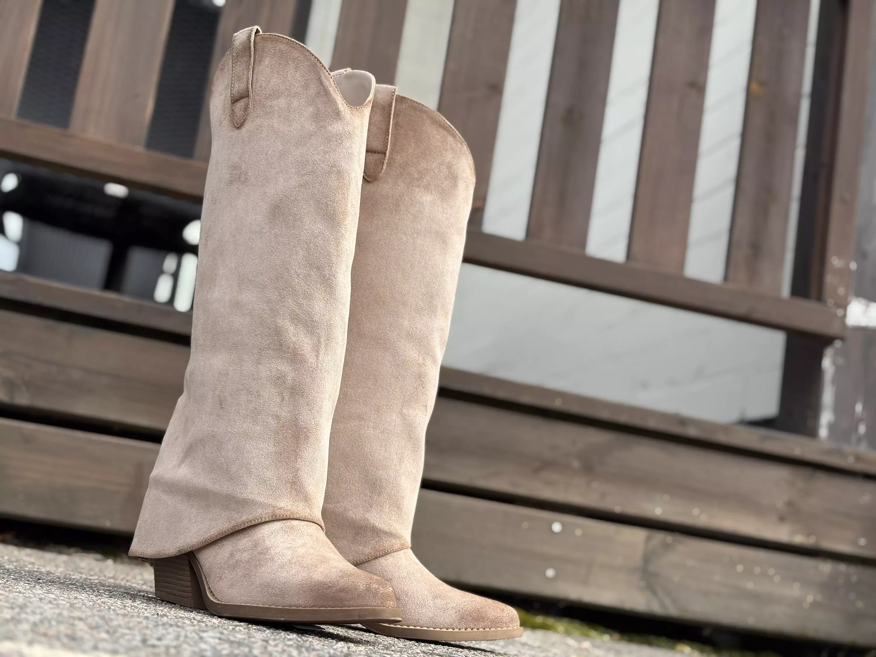 Beiget Duffy pitkävariset bootsit. Fold over bootsit, eli vapaasti käännettynä kääntövarrelliset buutsit, nilkkurit ja saappaat surffaavat trendien aallonharjalla! Tekstiilipintaiset korolliset bootsit. Varren yläreunassa tekstiiliset vetolenkit. Buutseille tuttuun tyyliin kapeneva kärki. Tukeva korko kaartuu linjakkaasti hieman kannan alle. Kääntövarsi ulottuu kengän takaosassa muutaman sentin päähän maasta. Lestimitoitukseltaan nämä kengät ovat normaalia mitoitusta. Kannan korkeus noin 6,5cm ja pohjan korkeus päkiän alta noin 1cm.