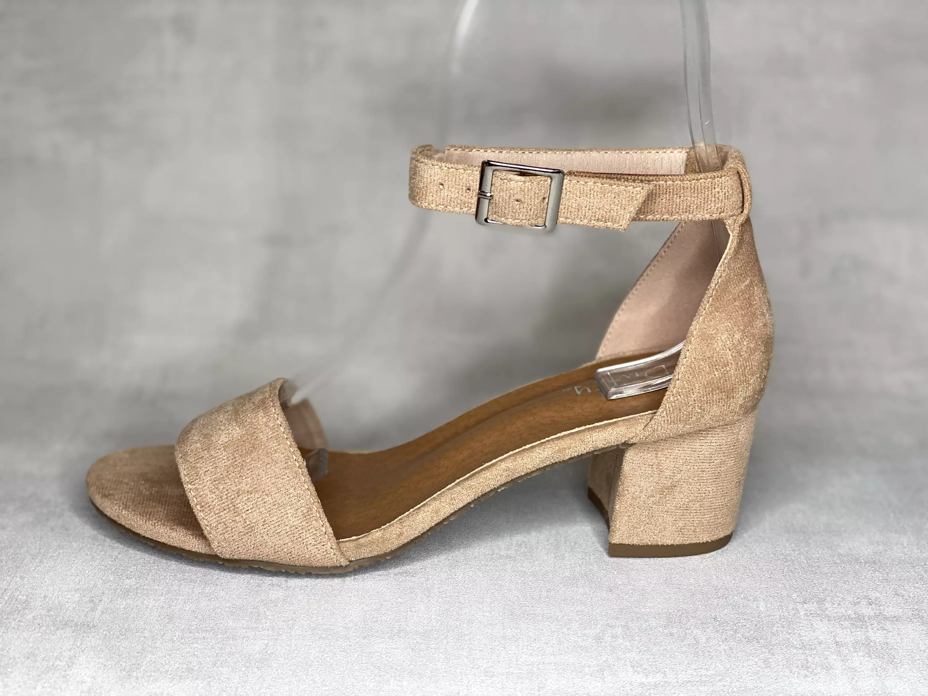 Nudet nilkkaremmilliset Duffy sandaalit. Mokkanahkaa muistuttava tekstiilipinta. Soljellinen nilkkaremmi, jossa pieni istuvuutta parantava venyke. Kannan korkeus noin 5,5cm.