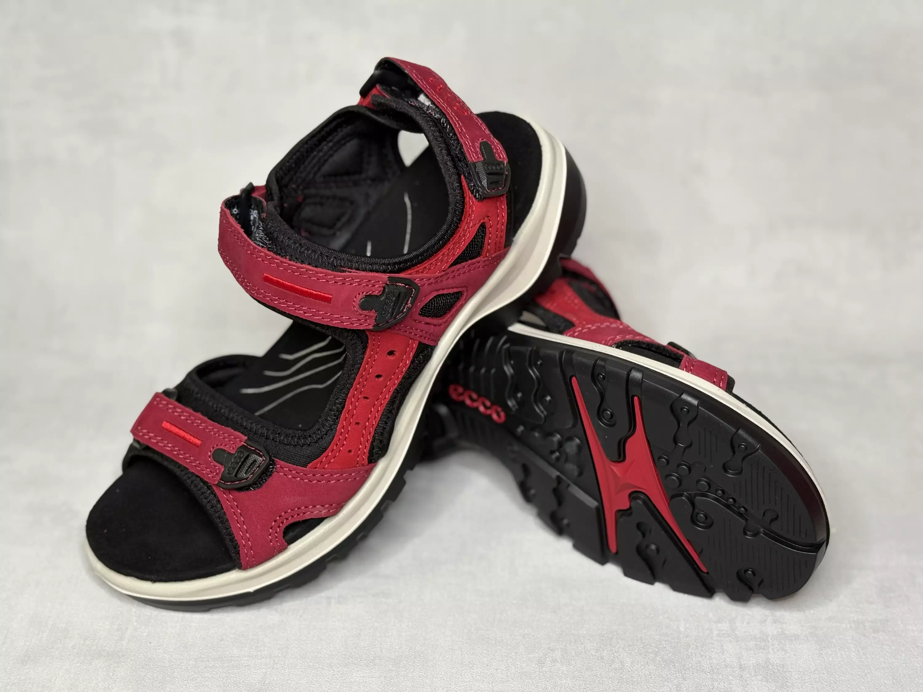 Punaiset naisten Ecco Offroad Brick/Chili Red sandaalit punaisilla yksityiskohdilla. Musta vuori ja sisäpohja. ECCO-jalkineet valmistetaan huolellisesti sopimaan jalkaan, eikä toisinpäin ja tämä logiikka toimii myös näiden Offroad-sandaalien kohdalla. Kengän pinta on nahkaa ja vuori tekstiiliä. Sandaaleiden istuvuutta omaan jalkaan voi säätää kolmella erillisellä tarraremmillä. Pitävä pohja. Kannan korkeus noin 3,5cm, edestä noin 2cm.
