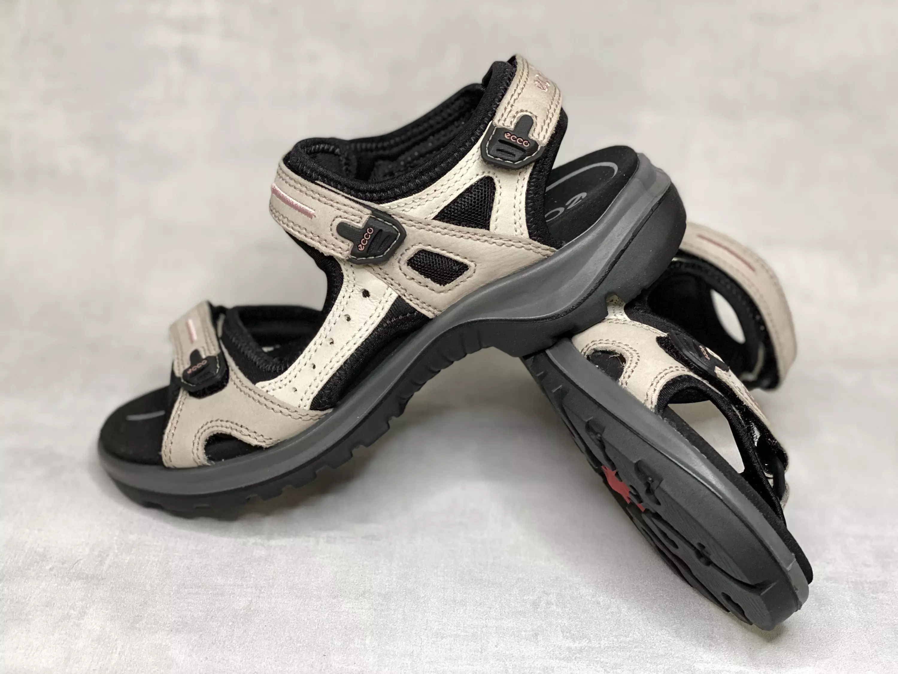 Beiget naisten Ecco Offroad sandaalit harmailla yksityiskohdilla. Musta vuori ja sisäpohja. ECCO-jalkineet valmistetaan huolellisesti sopimaan jalkaan, eikä toisinpäin ja tämä logiikka toimii myös näiden musta-harmaiden sandaalien kohdalla. Kengän pinta on nahkaa ja vuori tekstiiliä. Sandaaleiden istuvuutta omaan jalkaan voi säätää kolmella erillisellä tarraremmillä. Pitävä pohja. Kannan korkeus noin 3,5cm, edestä noin 2cm.