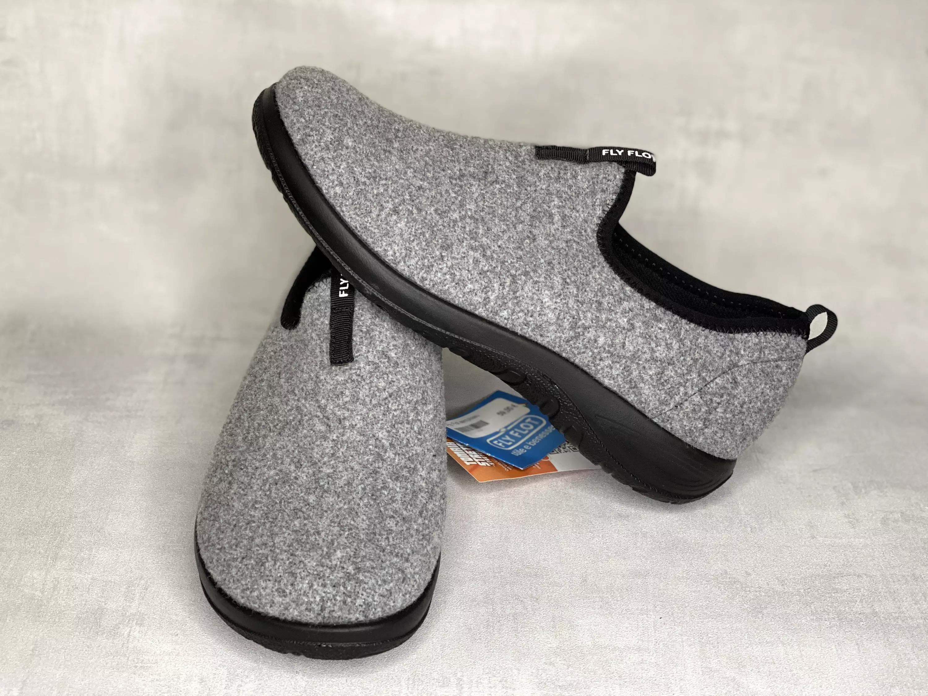 Ihanat vaaleanharmaat FlyFlot aamutossut . Vaihdettava pohjallinen, joka on pehmeä ja hyvin tärähdyksiä vaimentava. Näissä aamutossuissa on pohjaa sen verran, että ne jalassa voi sujuvasti kipaista ulkona vaikkapa postilaatikolla.