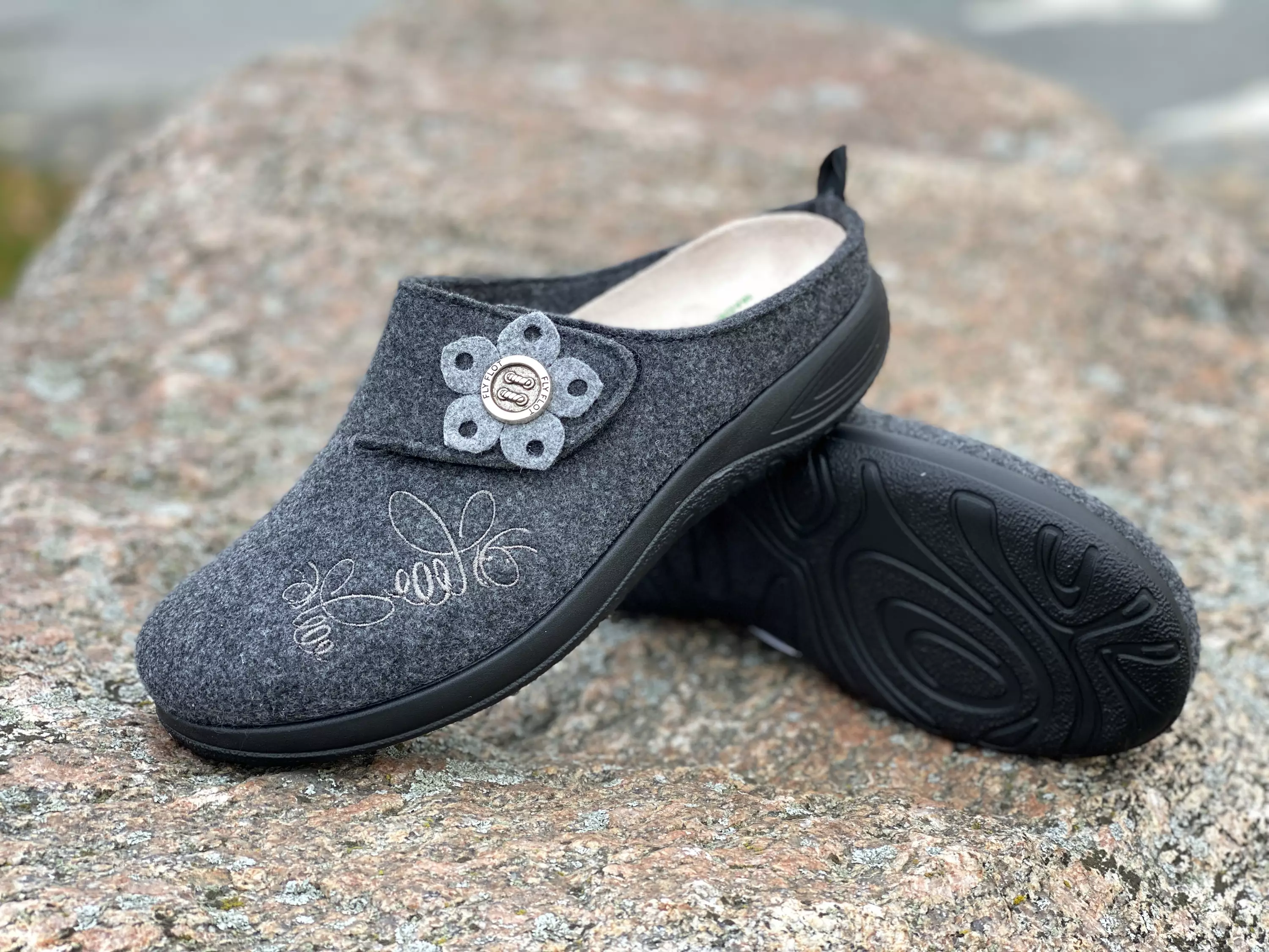 Harmaat leveälestiset Fly flot aamutossut. Tarraremmilliset huopatossut, joissa kirjottu kuviointi ja tarraremmissä koristeellinen kukka. Irrotettava pohjallinen, jonka tilalle sujautat vaivattomasti omaan jalkaasi parhaiten istuvan pohjallisen.Valmistettu Italiassa.