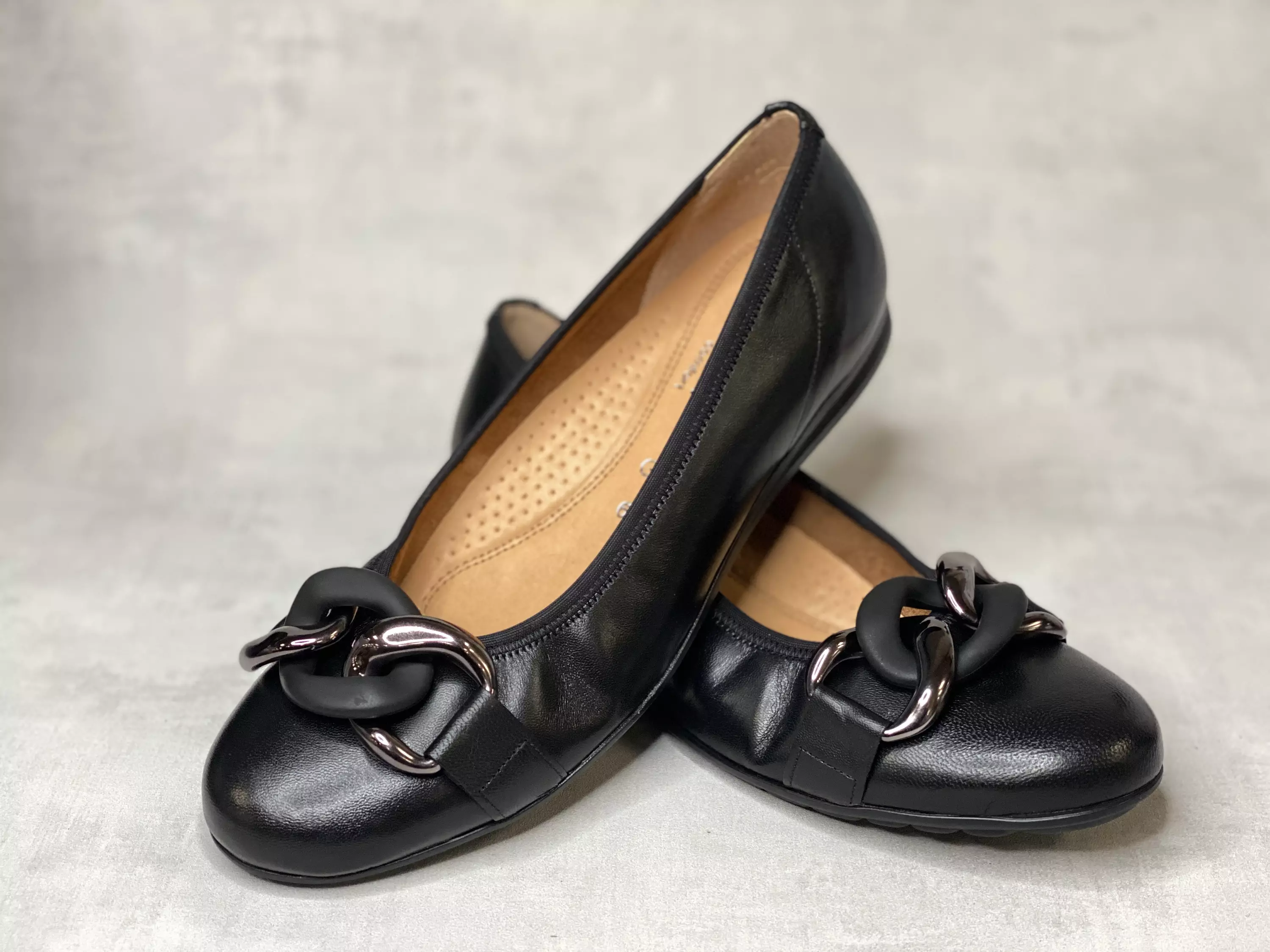 Mustat Gabor ballerinat. Kärjessä kolmilenkkinen muovinen ketjukoriste, jossa reunimmaiset lenkit ovat metallinväriset ja keskimmäinen musta. Ballerinoissa on pehmeä kevyesti muotoiltu sisäpohja, jossa on nahkapinta.