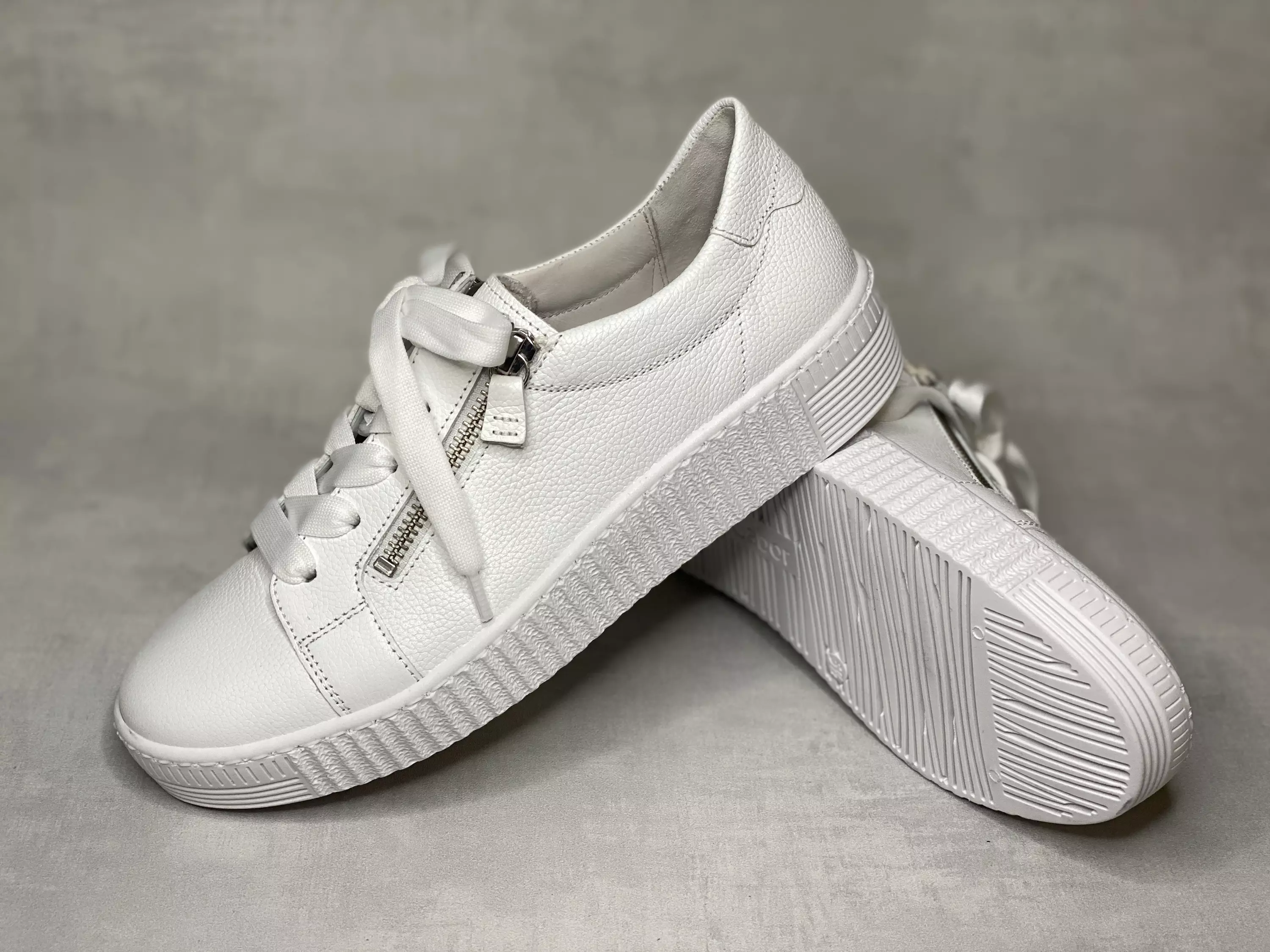 Valkoiset Gabor tennarit. Nauhojen lisäksi tennarissa on kaksi vetoketjua, jotka tuovat ilmettä ja helpottavat pukemista! Nahkapintainen pohjallinen, joka on tarpeen vaatiessa vaihdettavissa omaan jalkaasi parhaiten sopivaan pohjalliseen.