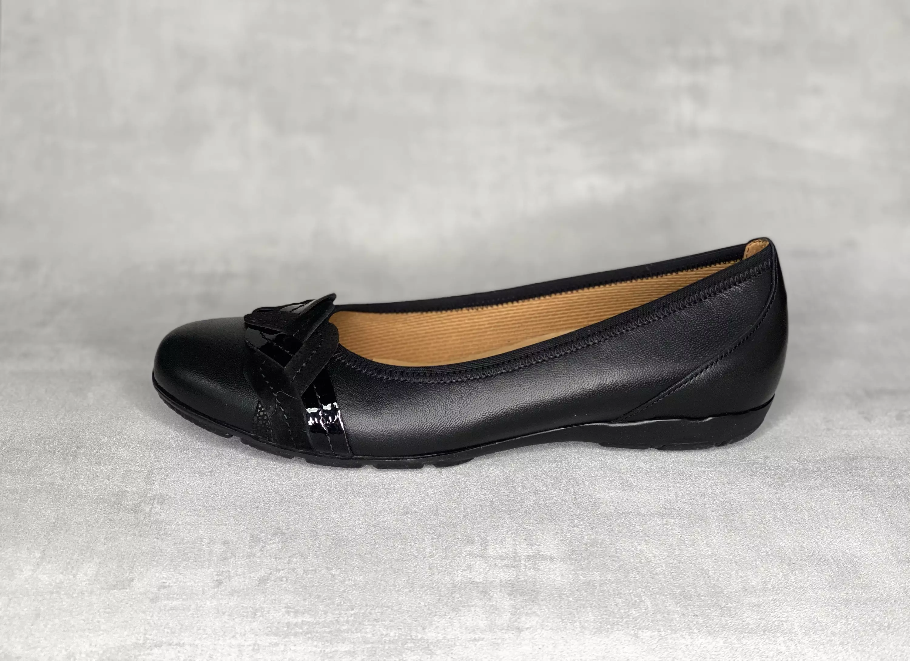 Mustat Gabor ballerinat upealla punoskoristeisella kärjellä. Kiinteä nahkapintainen sisäpohjallinen on kevyesti muotoiltu. Kärjessä näyttävä palmikkokoriste. Kapea F lesti.