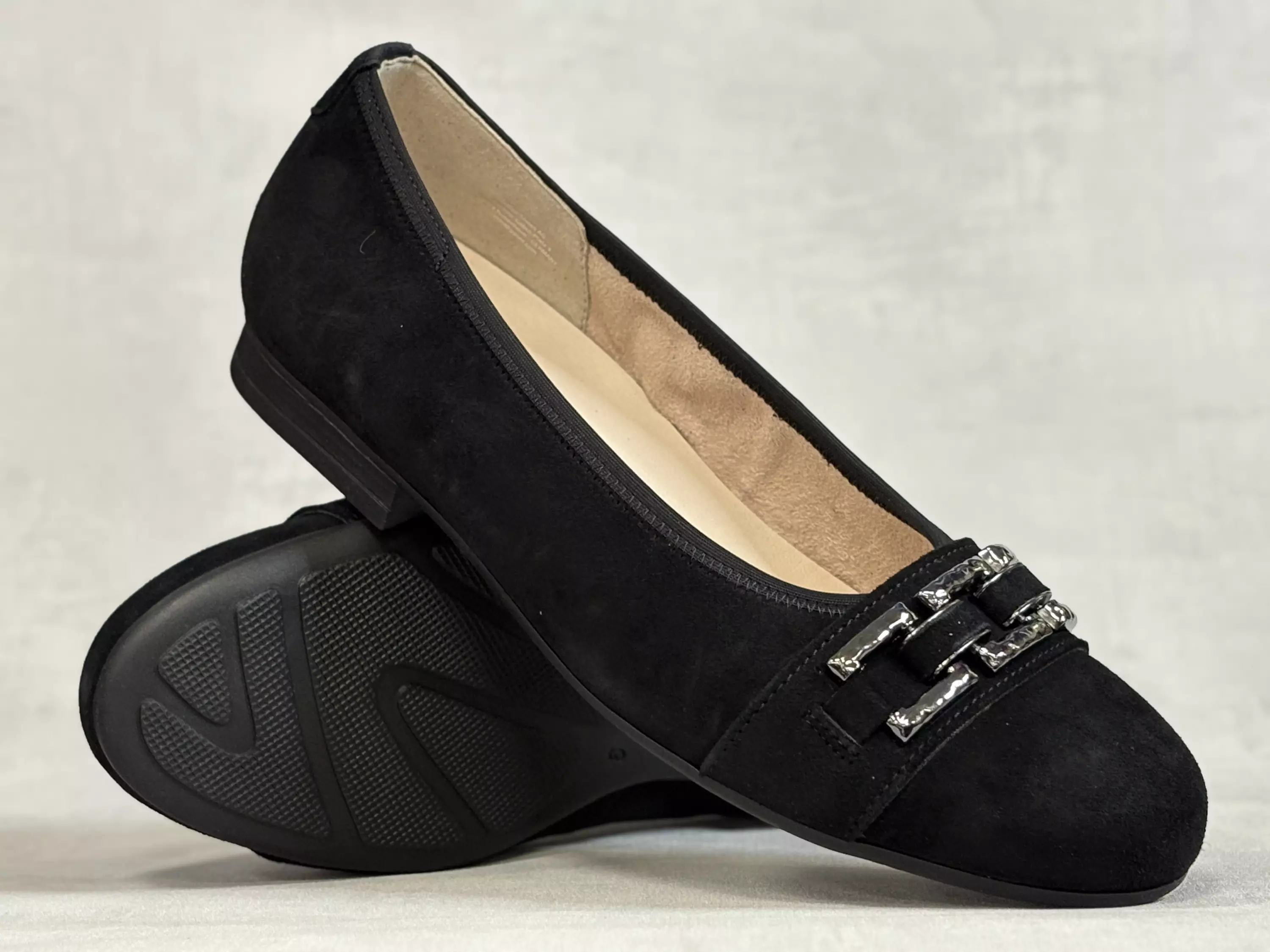 Mustat Gabor ballerinat hopean värisellä kärkikoristeella