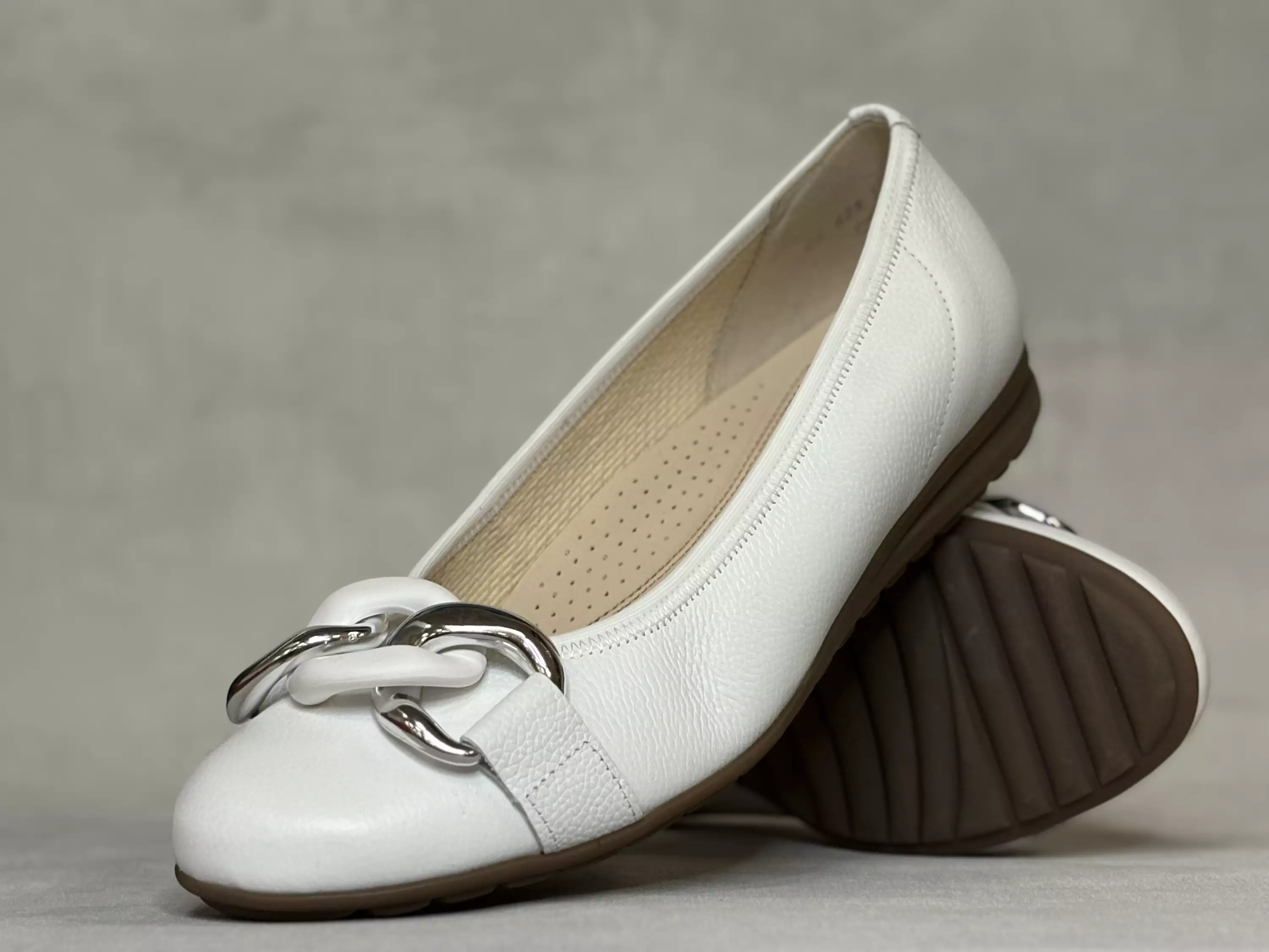 Valkoiset Gabor ballerinat hopea-valkoisella ketjukoristeella
