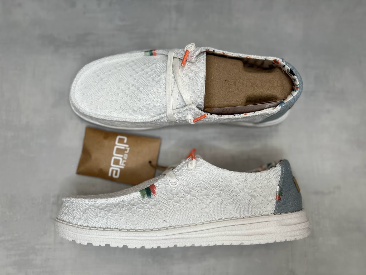 Pääväriltään valkoiset Heydude Wendy Boho white crochet kävelykengät. Kannassa harmaata ja pieni kirjailtu kuvio. Valkoiset kengännauhat vaaleanpunaisilla päillä. Kuvioitu vuori. Leveä lesti ja vaihdettava korkkipintainen pohjallinen, joten tähän kenkään sujahtaa vaivattomasti omaan jalkaasi parhaiten sopivat pohjalliset! Mokkasiinimaisen rakenteen vuoksi kengässä on varpaille runsaasti tilaa.
