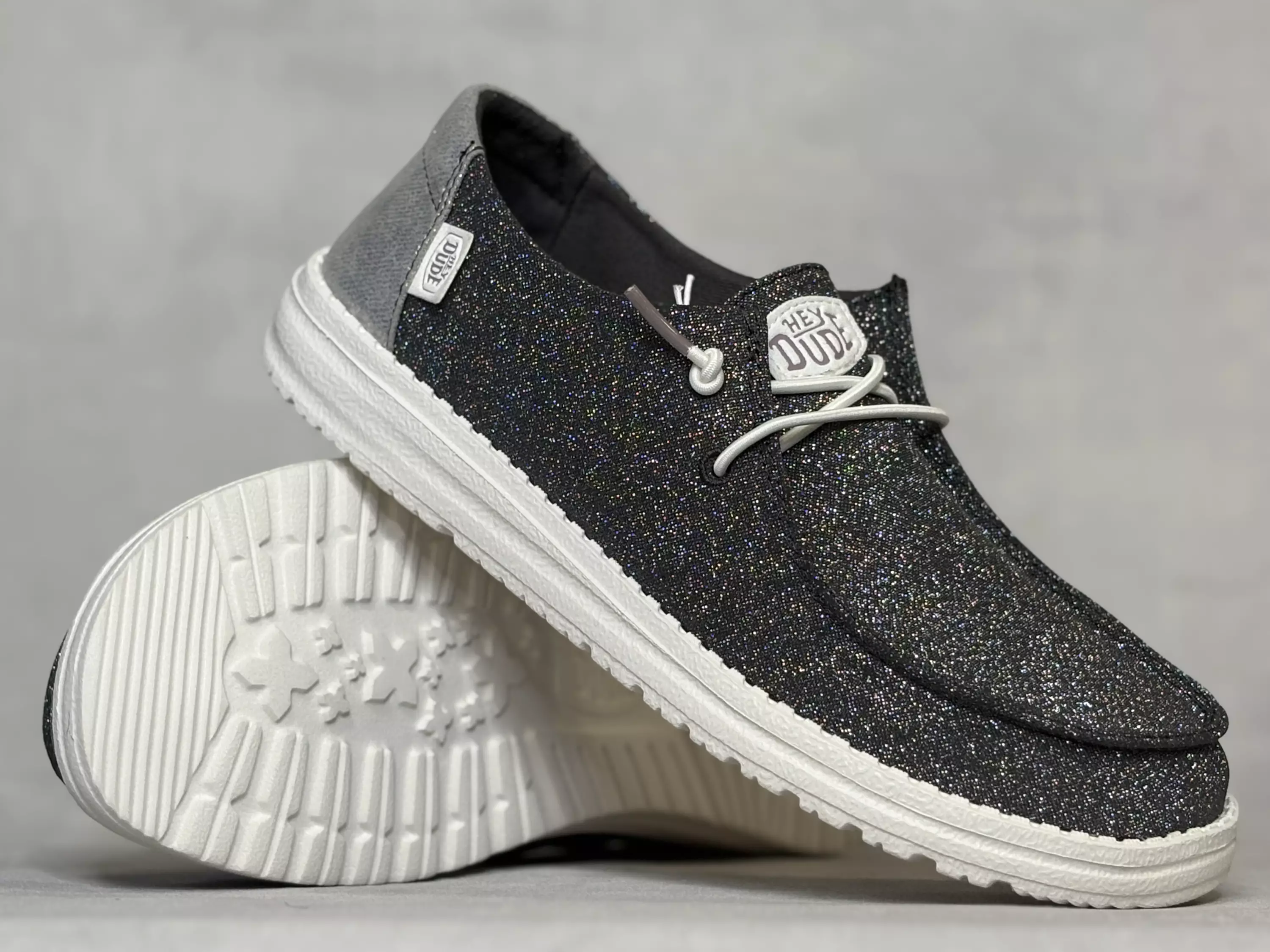 Kimaltavat ja tummanharmaan väriset naisten Hey Dude Wendy Metallic Sparkle Charcoal kangaskengät. Kimaltavan, metallisen tummanharmaan värinen tekstiilipinta ja vaaleat kengännauhat. Valkoinen ulkopohja ja kanta on metallisen vaaleanharmaa. Näissä kengissä riittää kimalletta! Vaihdettavat pohjalliset, joten tarpeen vaatiessa sujautat kenkiin omaan jalkaasi parhaiten sopivat pohjalliset. Mokkasiinimallisessa kengässä on hyvin tilaa varpaille.