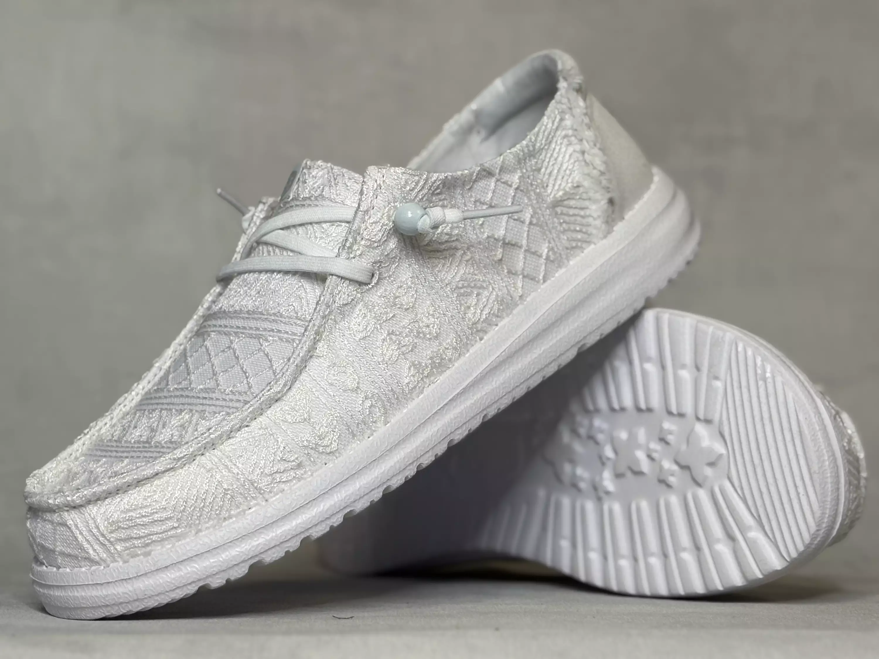 Valkoiset Heydude Wendy Crochet Lace white kävelykengät. Kauttaaltaan valkoinen, kirjaillulla pinnalla varustettu kevyt kesäkenkä. Valkoiset kengännauhat ja kannassa ruskea logo-padge. Leveä lesti ja vaihdettava pehmeä pohjallinen, joten tähän kenkään sujahtaa vaivattomasti omaan jalkaasi parhaiten sopivat pohjalliset! Mokkasiinimaisen rakenteen vuoksi kengässä on varpaille runsaasti tilaa.