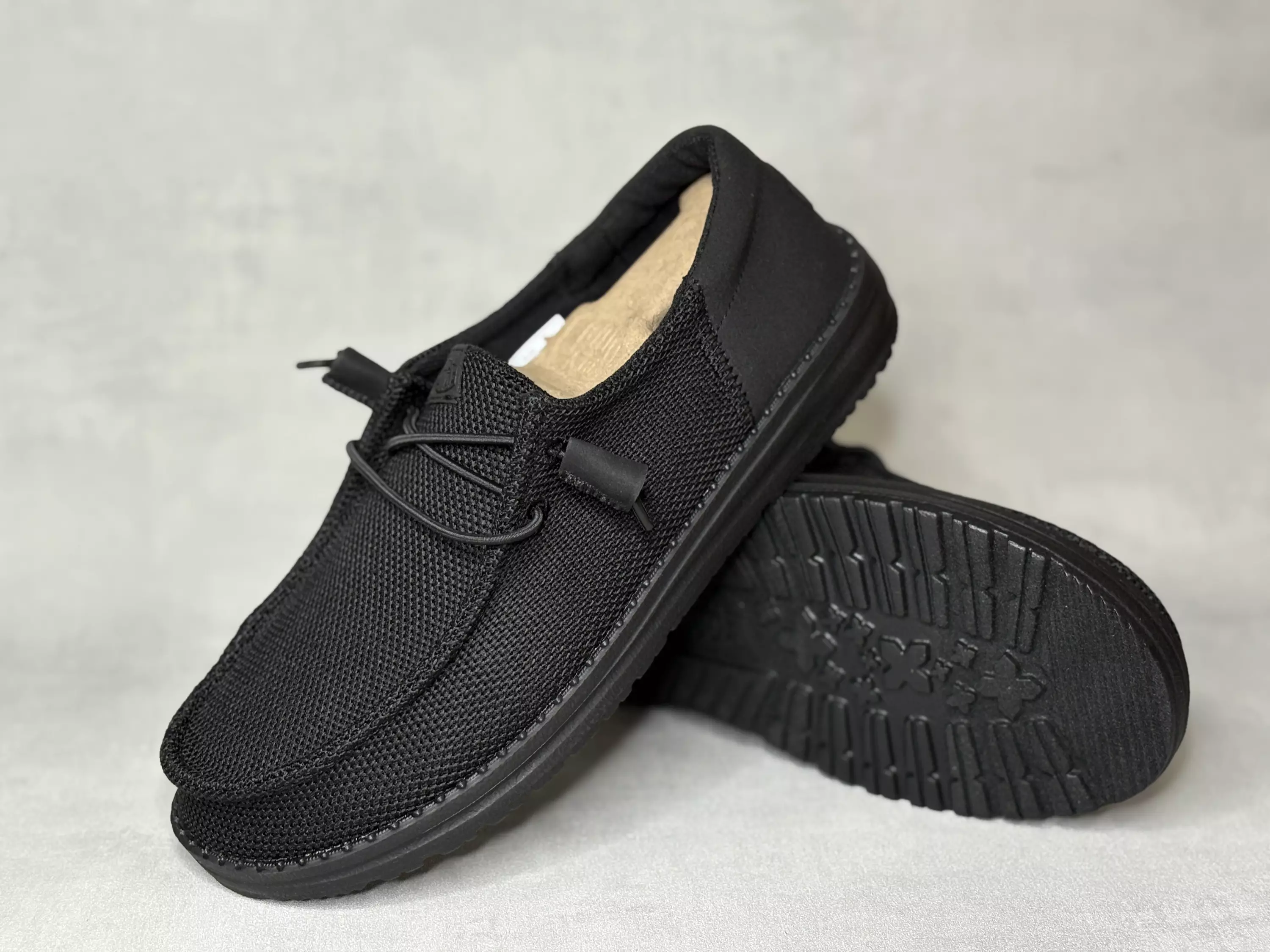 Mustat naisten Hey Dude Wendy Funk Mono Black kangaskengät. Kokomusta tekstiilipinta, kevyesti joustavat kengännauhat ja kokovalkoinen ulkopohja. Vaihdettavat pohjalliset, joten tarpeen vaatiessa sujautat kenkiin omaan jalkaasi parhaiten sopivat pohjalliset. Mokkasiinimallisessa kengässä on hyvin tilaa varpaille.