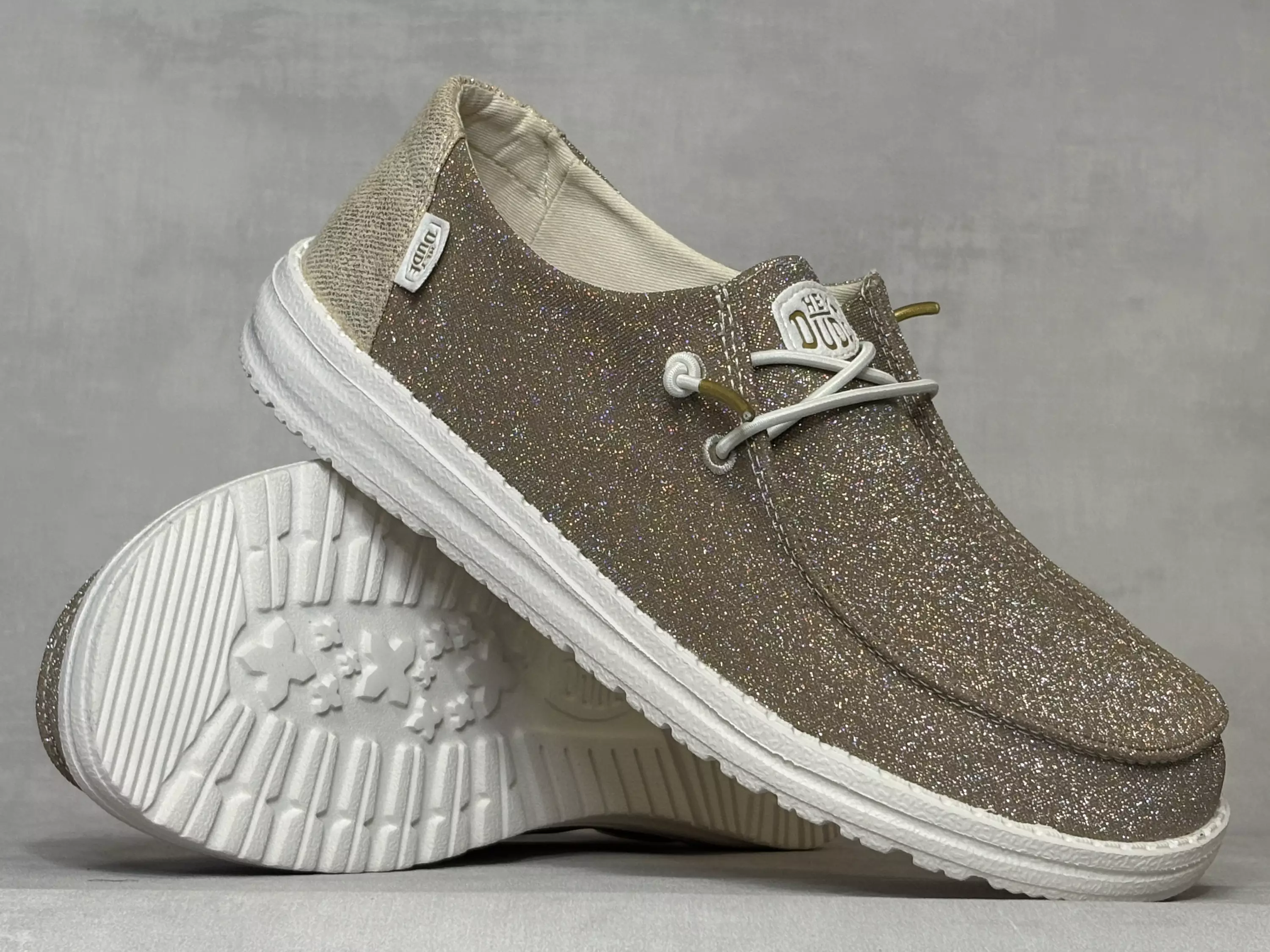 Kimaltavat ja kullan väriset naisten Hey Dude Wendy Metallic Sparkle Gold kangaskengät. Kimaltavan, kullan värinen tekstiilipinta ja vaaleat kengännauhat kultaisilla päillä. Valkoinen ulkopohja ja kanta on metallisen kulta. Näissä kengissä riittää kimalletta! Vaihdettavat pohjalliset, joten tarpeen vaatiessa sujautat kenkiin omaan jalkaasi parhaiten sopivat pohjalliset. Mokkasiinimallisessa kengässä on hyvin tilaa varpaille.