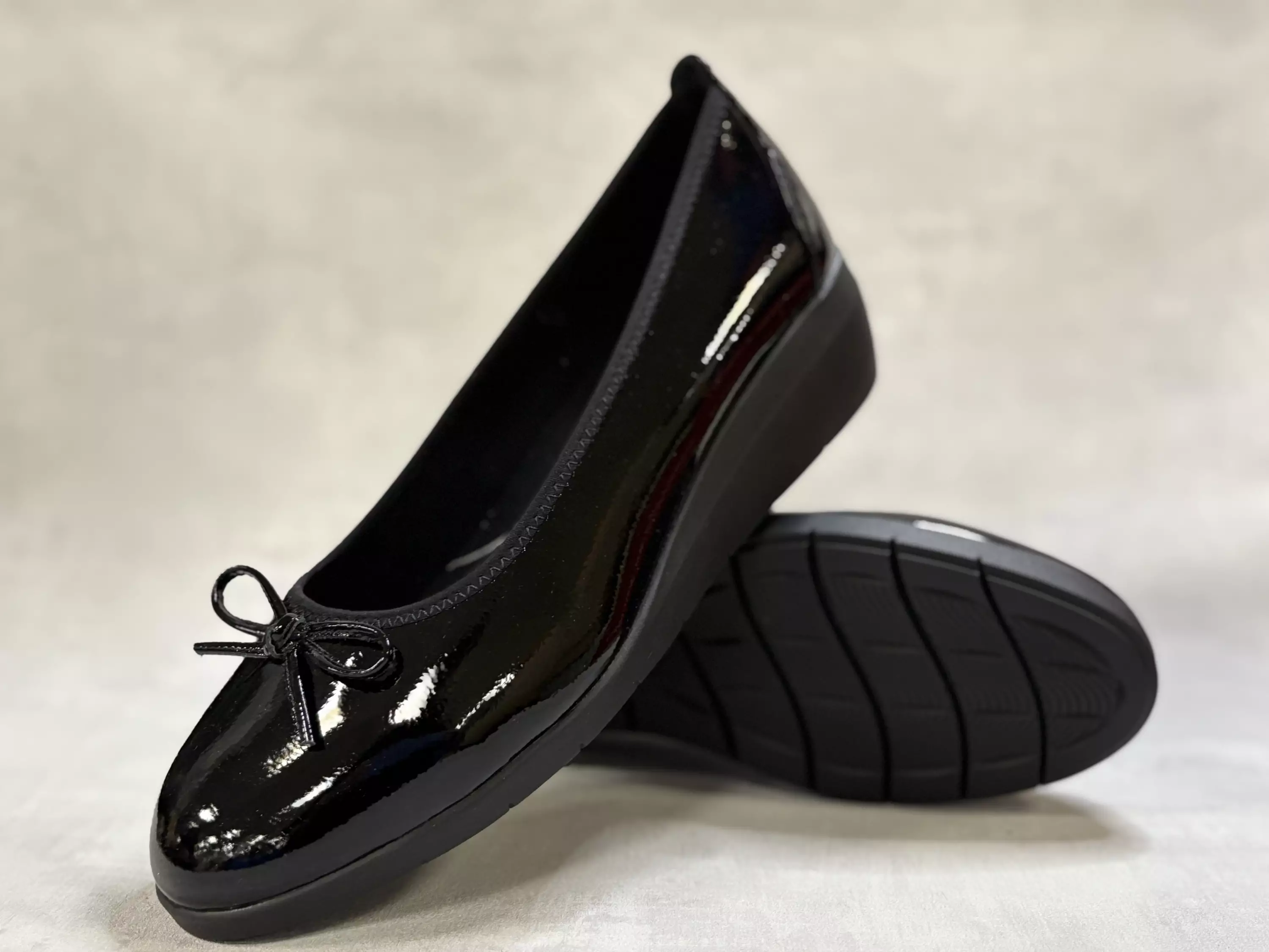 Mustat Jana korkokengät. Kiilapohjaiset H-lestiset avokkaat, joiden kärjessä on sievä rusetti. Noin 4cm korkea kanta, pohjan korkeus päkiän alta noin 1cm.