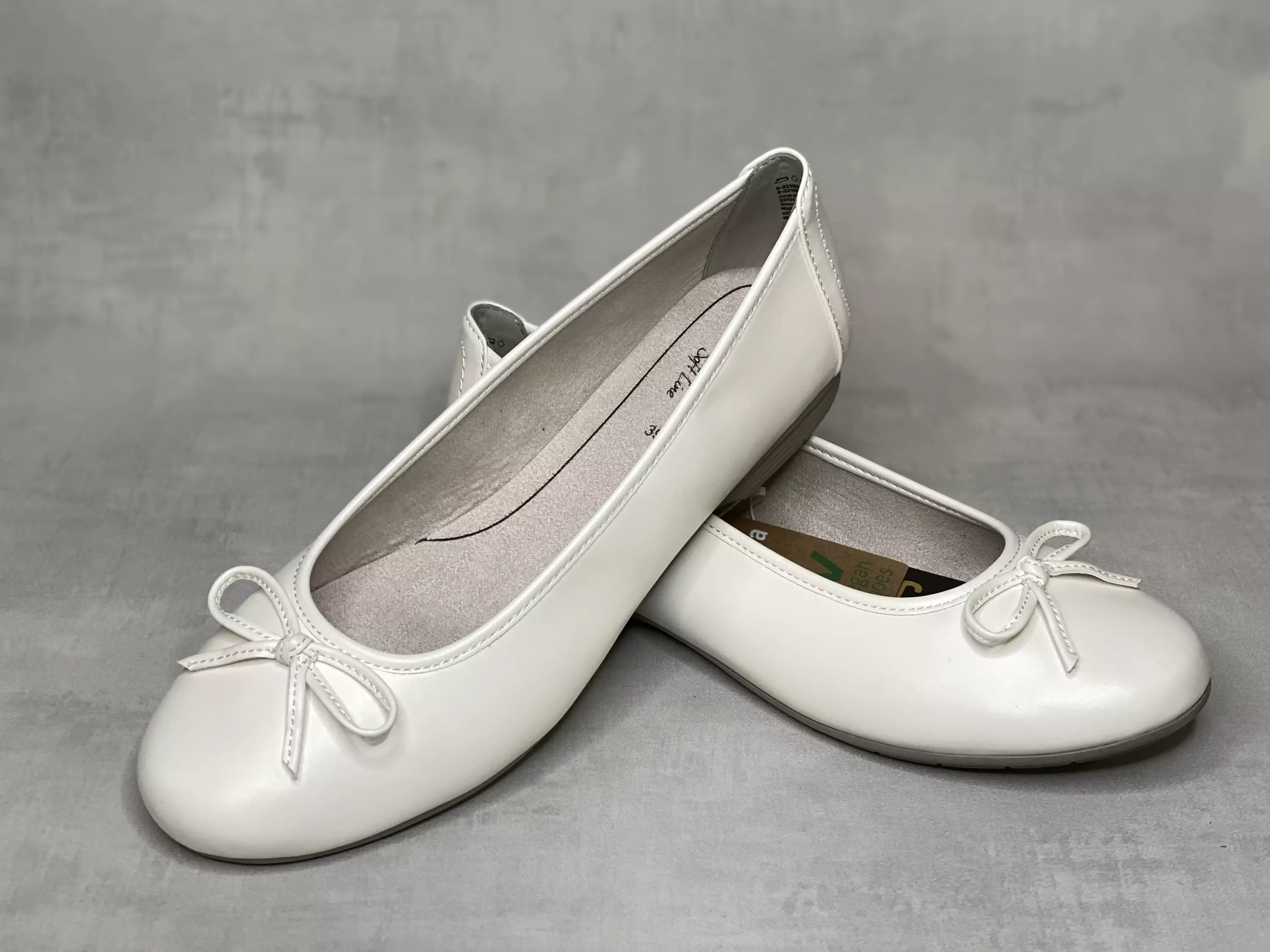 Valkoiset Jana ballerinat. Nämä ballerinat on varustettu sievällä rusettikoristeella. Klassiset ballerinat ovat moneen menoon sopivat kesäkengät, jotka käyvät mainiosti niin farkkujen kuin mekonkin kaveriksi. 1,5cm korkea kanta, pohjan korkeus edestä 0,5cm.