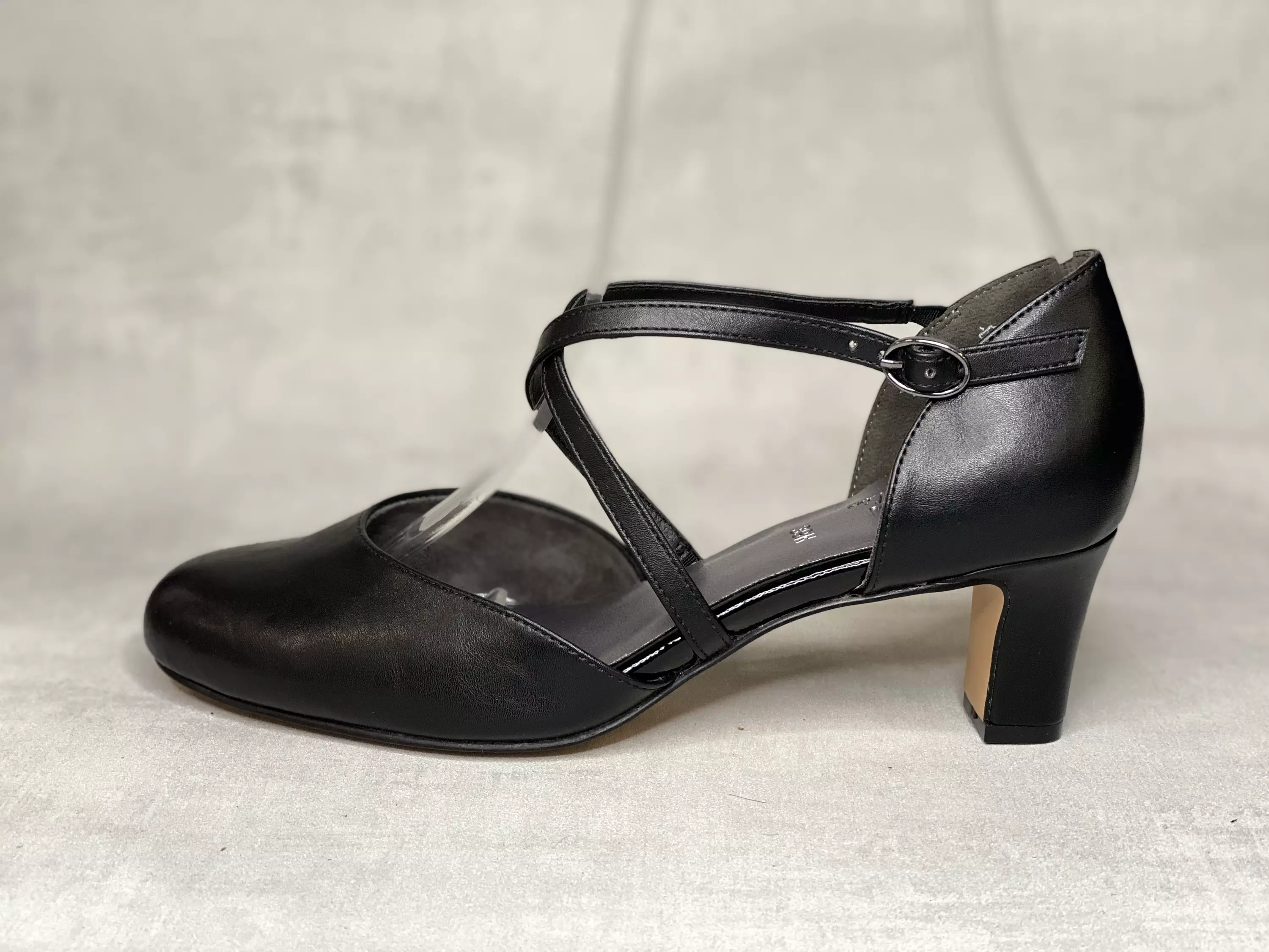 Mustat Jana korkokengät. Kahdella ristikkäin kulkevalla remmillä varustetut H-lestiset avokkaat. Molemmissa remmeissä on istuvuutta parantavat venykkeet ja toisessa remmissä kengän ulkosyrjälle sijoittuva metallinen solki.