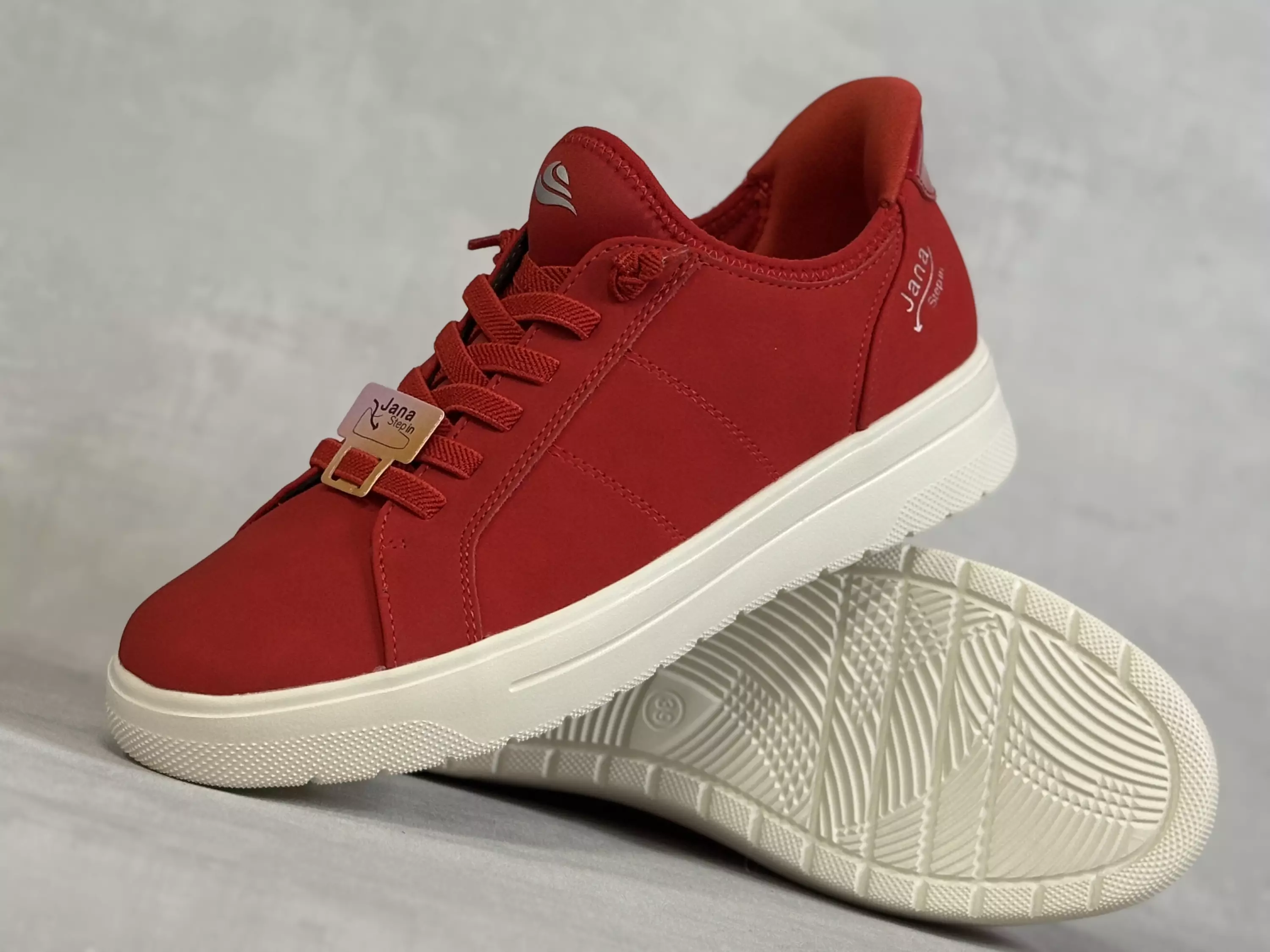 Punaiset Jana Red - Step in tennarit. Kenkälusikkakannalla varustetut kevyet venykenauhaiset tennarit. Lestimitoitus H. Vaihdettavat pohjalliset, joten tarvittaessa sujautat tennareihin omiin tarpeisiisi parhaiten sopivat pohjalliset. Kannan korkeus noin 3cm ja pohjan korkeus päkiän alta noin 2cm.