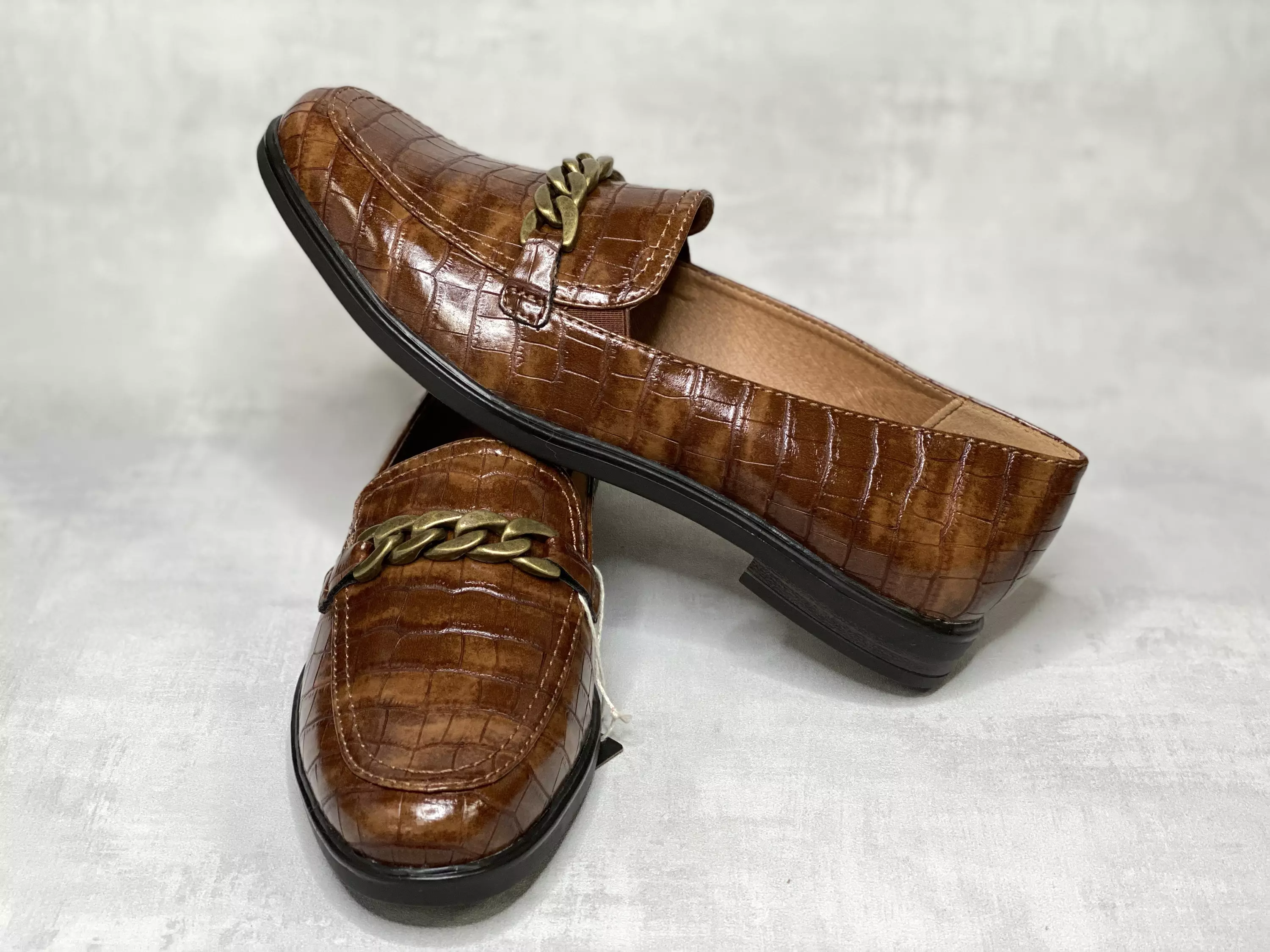 Konjakinruskeat krokokuosiset Jana loaferit ketjukoristeella