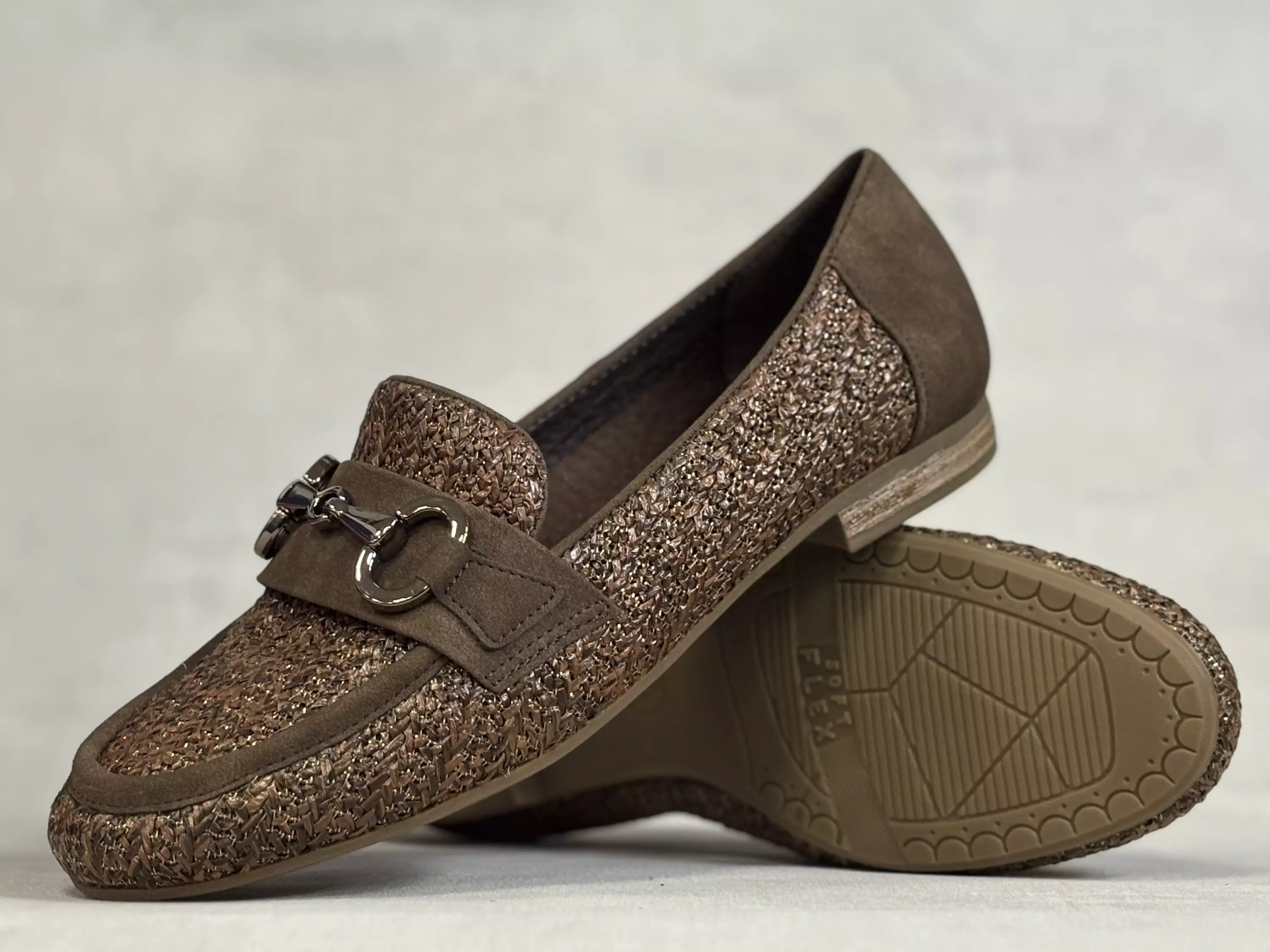 Ruskeat Jana Mocca loaferit. Punospintaiset kävelykengät, joissa metallinen kärkikoriste. Leveähkö (H) lesti. Kannan korkeus noin 1,5cm ja pohjan korkeus päkiän alta noin 0,5cm.