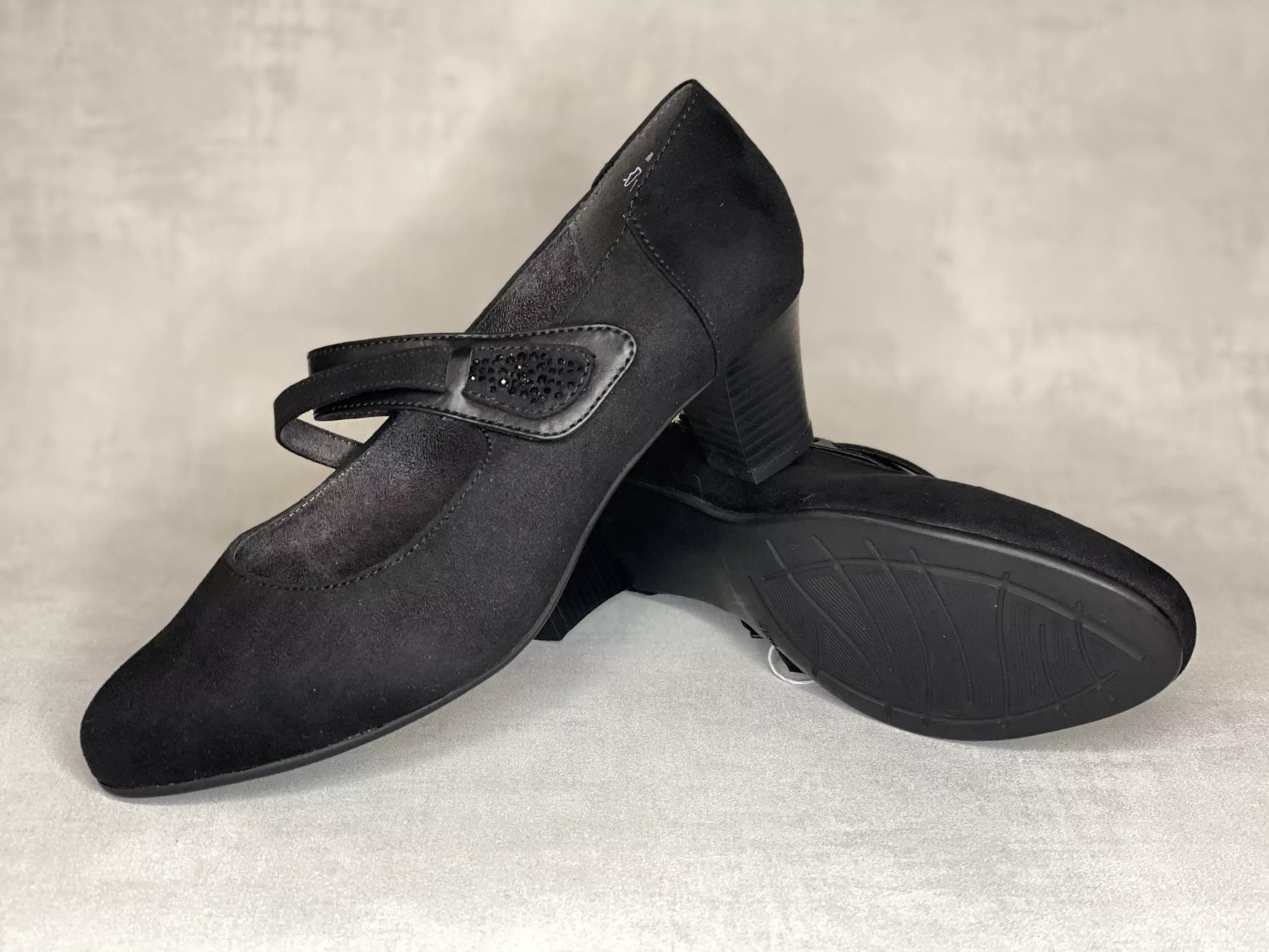 Mustat Jana korkokengät. Tarrallisella remmillä varustetut H-lestiset korkkarit. Remmi koostuu kahdesta remmistä, joista alempi on pintanahkaa muistuttava, päälimmäinen on kengän muun pinnan tavoin pehmeää mikrokuitua. Tarrallisessa päädyssä remmiä on kimaltavat strassikoristeet. Maltillinen noin 5cm korkea korko.