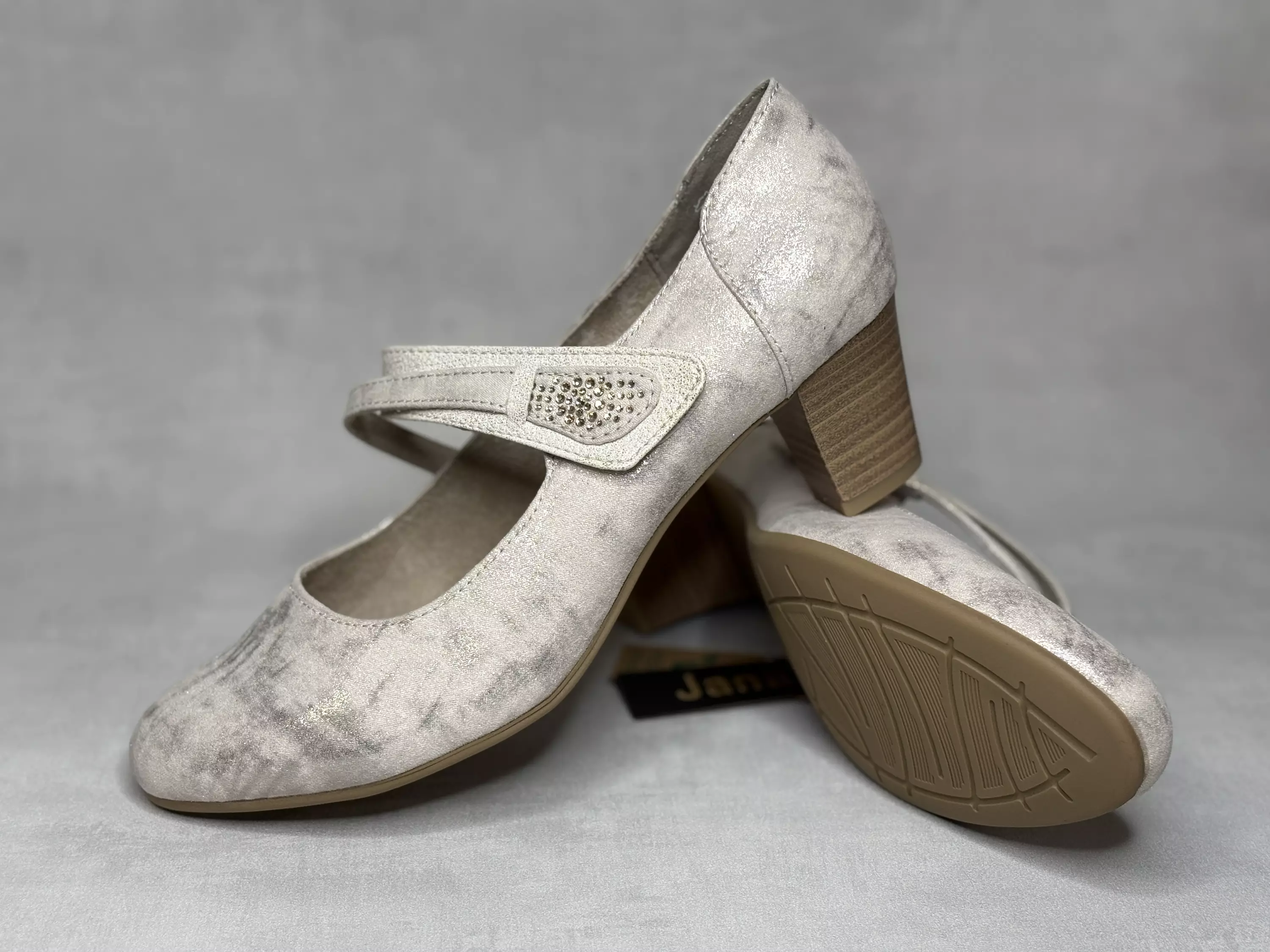 Beige kultaiset Jana korkokengät. Tarrallisella remmillä varustetut H-lestiset korkkarit. Remmi koostuu kahdesta remmistä, joista alempi on pintanahkaa muistuttava, päälimmäinen on kengän muun pinnan tavoin pehmeää mikrokuitua. Tarrallisessa päädyssä remmiä on kimaltavat strassikoristeet. Maltillinen noin 5cm korkea korko.