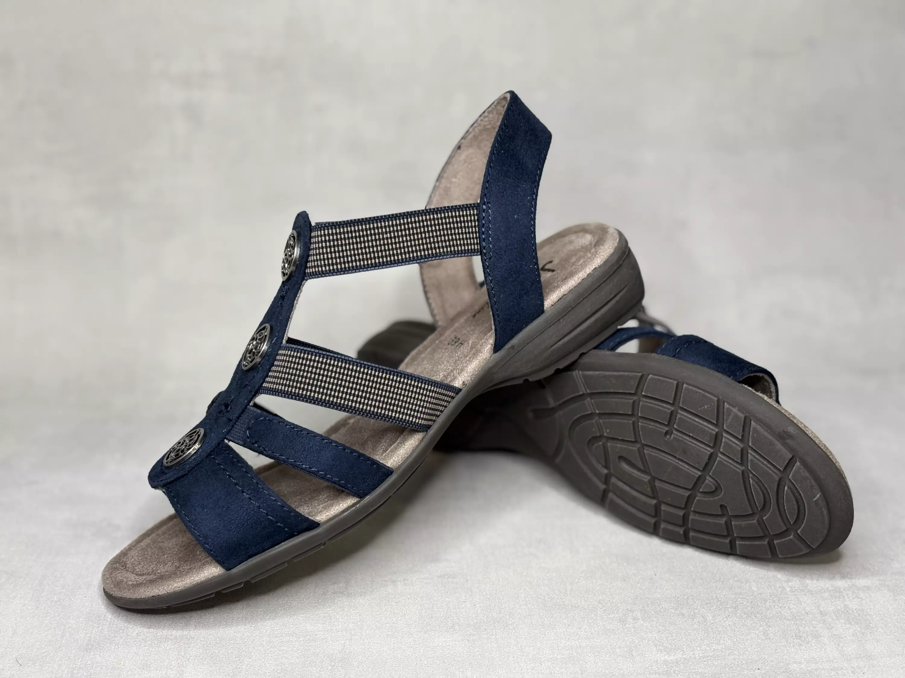 Venykeremmeillä varustetut tummansiniset Jana sandaalit. Metalliset koristeet antavat kengälle juhlavaa ilmettä. Matalakantainen sandaali sopii monenlaiseen jalkaan. Hieman normaalia leveämpi H-lesti. Yli 50% materiaalista on kierrätettyä PET-muovia.