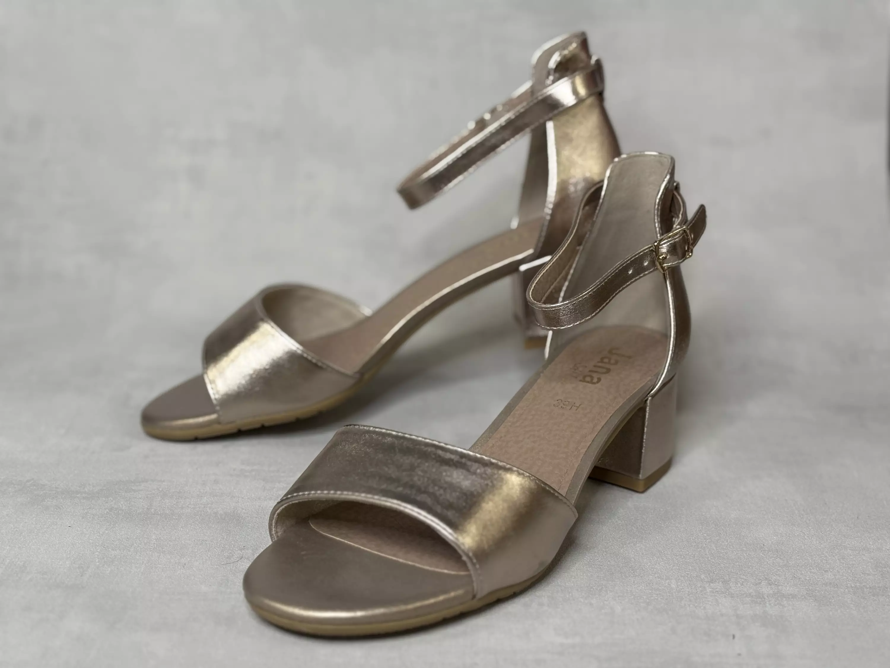 Kultaiset Jana sandaletit. Matalakorkoiset nilkkaremmilliset Jana sandaalit. Soljellinen nilkkaremmi. Solki on kiinni pienessä istuvuutta parantavassa venykkeessä. H lesti. Kannan korkeus noin 4,5cm ja pohjan korkeus päkiän alta noin 1cm-