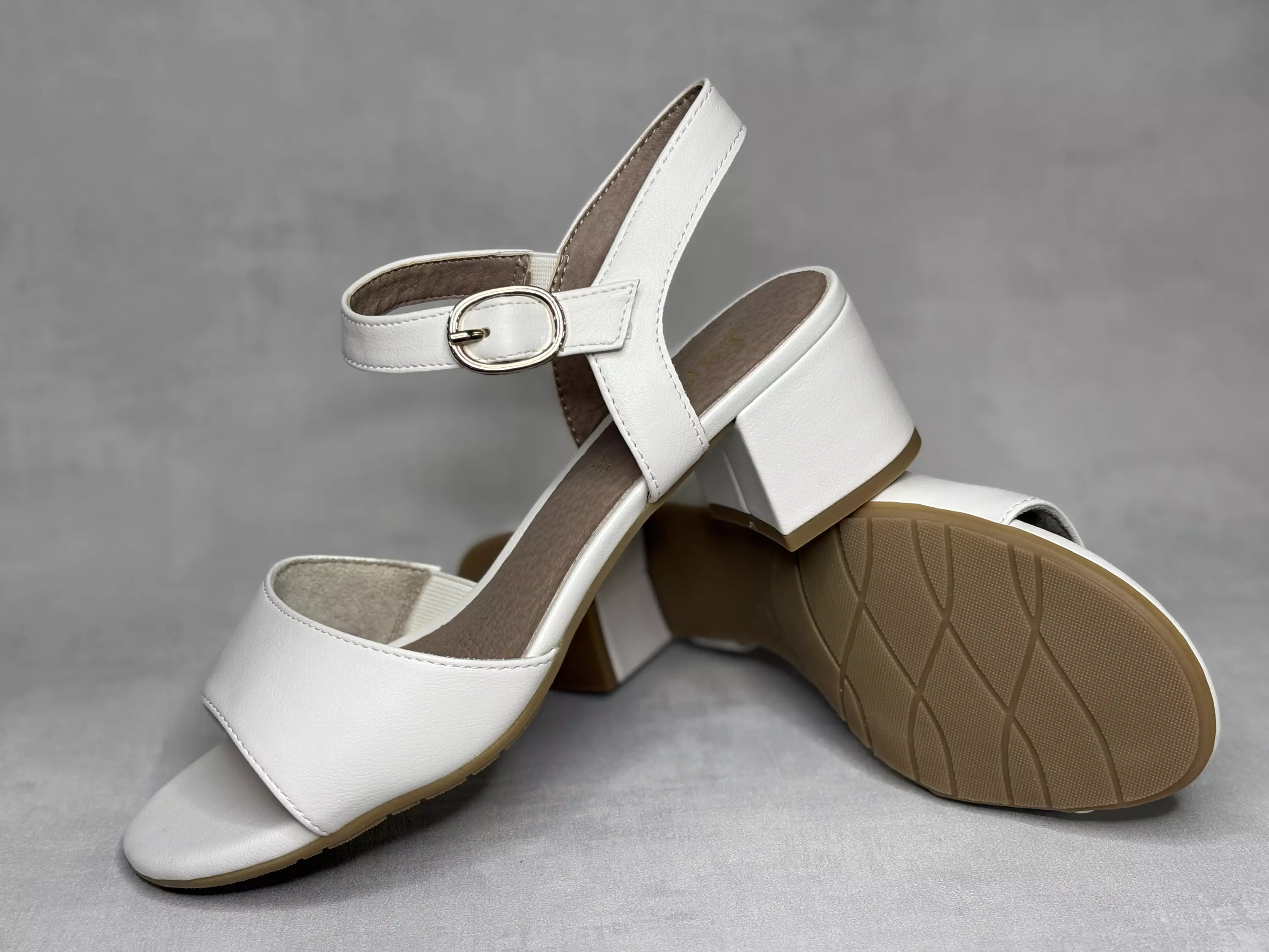 Valkoiset Jana sandaalit. Matalakorkoiset tarraremmilliset sandaalit. Remmissä sisäsyrjällä istuvuutta parantava venyke. H lesti. Kannan korkeus noin 5cm ja pohjan korkeus päkiän alta noin 1cm. Vegaaniset.